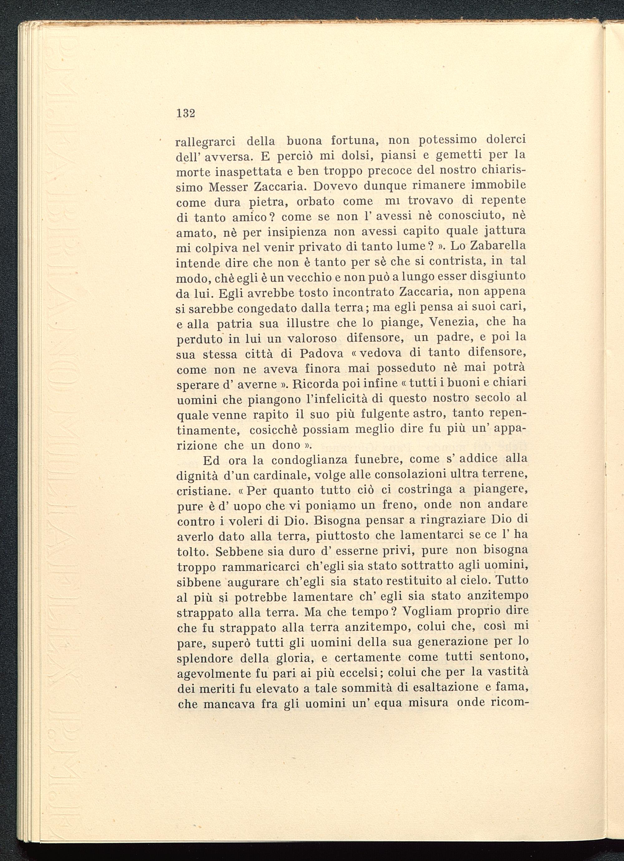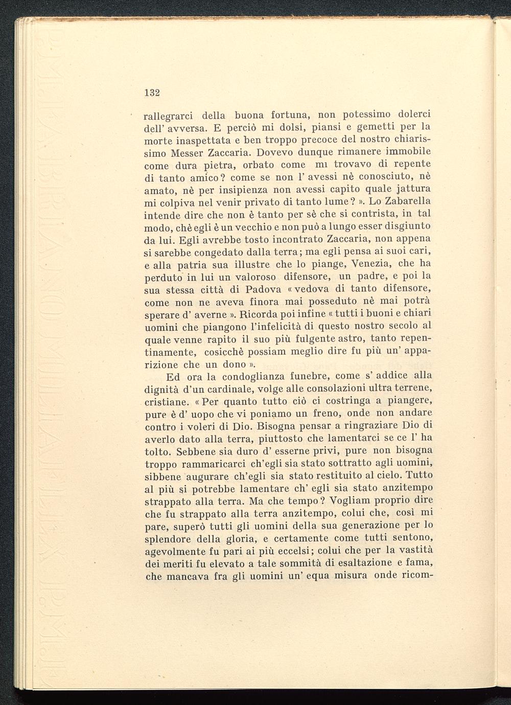 Ed ora la condoglianza funebre, come s' addice alladignità d'un cardinale, volge alle consolazioni ultra terrene,cristiane. « Per quanto tutto ciò ci costringa a piangere,pure è d' uopo che vi poniamo un freno, onde non andarecontro i voleri di Dio. Bisogna pensar a ringraziare Dio diaverlo dato alla terra, piuttosto che lamentarci se ce 1' hatolto. Sebbene sia duro d' esserne privi, pure non bisognatroppo rammaricarci ch'egli sia stato sottratto agli uomini,sibbene augurare ch'egli sia stato restituito al cielo. Tuttoal più si potrebbe lamentare eh' egli sia stato anzitempostrappato alla terra. Ma che tempo ? Vogliam proprio direche fu strappato alla terra anzitempo, colui che, così mipare, superò tutti gli uomini della sua generazione per losplendore della gloria, e certamente come tutti sentono,agevolmente fu pari ai più eccelsi; colui che per la vastitàdei meriti fu elevato a tale sommità di esaltazione e fama,che mancava fra gli uomini un' equa misura onde ricom-