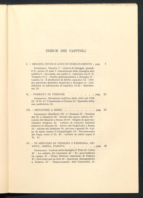 Sommario: Nascita 7 - Guerra di Chioggia quandoilTr. aveva 10 anni 7-Ammissione della famiglia allanobiltà 8 - Giovanni, suo padre 8 - Amicizia con P. P.Vergerio 9-11 - Studia giurisprudenza a Bologna 11 -Laurea 12 - È professore di diritto canonico 12 - Ulti-ma questione giuridica disputata a Bologna 14 - Can-didatura al patriarcato di Aquileia 16-20 - Matrimo-nio 20.
