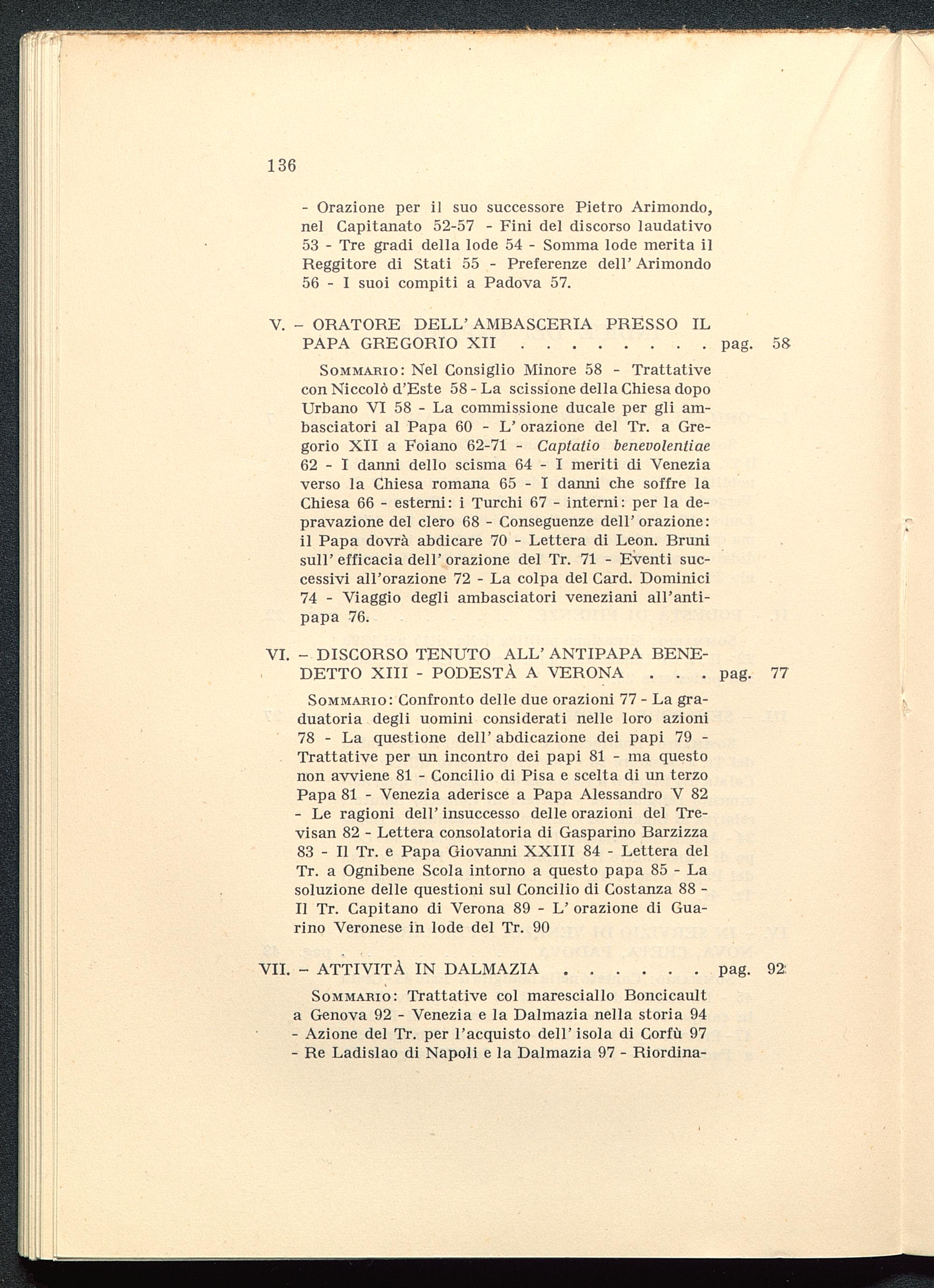 - Le ragioni dell' insuccesso delle orazioni del Tre-visan 82 - Lettera consolatoria di Gasparino Barzizza83 - Il Tr. e Papa Giovanni XXIII 84 - Lettera delTr. a Ognibene Scola intorno a questo papa 85 - Lasoluzione delle questioni sul Concilio di Costanza 88 -Il Tr. Capitano di Verona 89 - L' orazione di Gua-rino Veronese in lode del Tr. 90