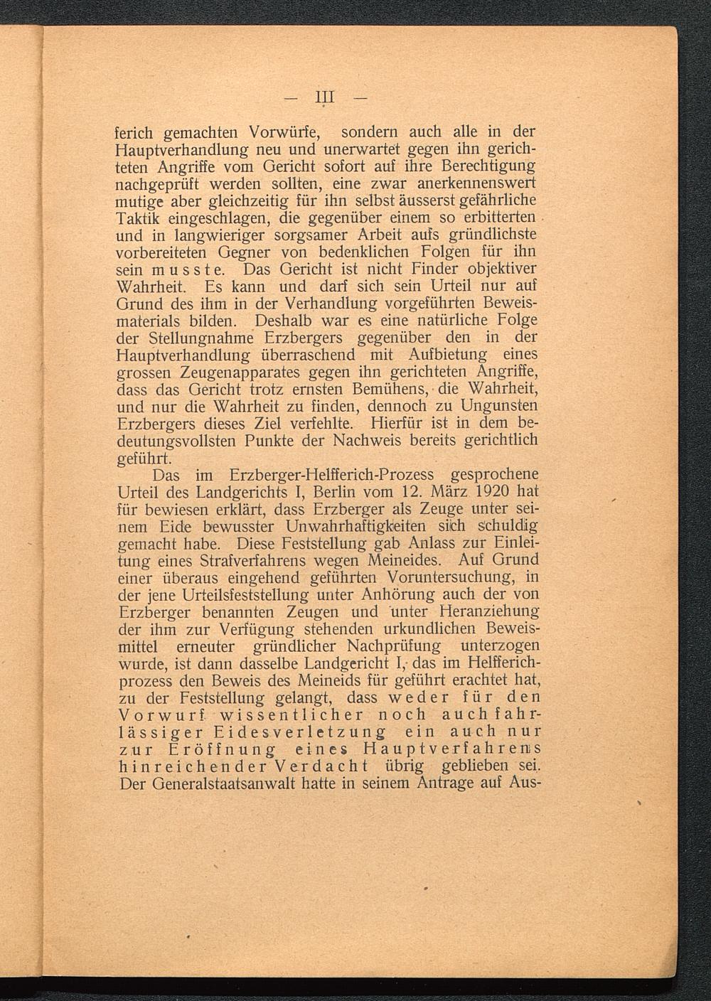Das im Erzberger-Helfferich-Prozess gesprocheneUrteil des Landgerichts I, Berlin vom 12. März 1920 hatfür bewiesen erklärt, dass Erzberger als Zeuge unter sei-nem Eide bewusster Unwahrhaftigkeiten sich schuldiggemacht habe. Diese Feststellung gab Anlass zur Einlei-tung eines Strafverfahrens wegen Meineides. Auf Grundeiner überaus eingehend geführten Voruntersuchung, inder jene Urteilsfeststellung unter Anhörung auch der vonErzberger benannten Zeugen und unter Heranziehungder ihm zur Verfügung stehenden urkundlichen Beweis-mittel erneuter gründlicher Nachprüfung unterzogenwurde, ist dann dasselbe Landgericht I, das im Helfferich-prozess den Beweis des Meineids für geführt erachtet hat,zu der Feststellung gelangt, dass weder für denVorwurf wissentlicher noch auch fahr-lässiger Eidesver 1 etzung ein auch nurzur Eröffnung eines HauptverfahreniShinreichender Verdacht übrig geblieben sei.Der Generalstaatsanwalt hatte in seinem Antrage auf Aus-
