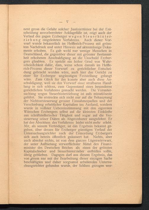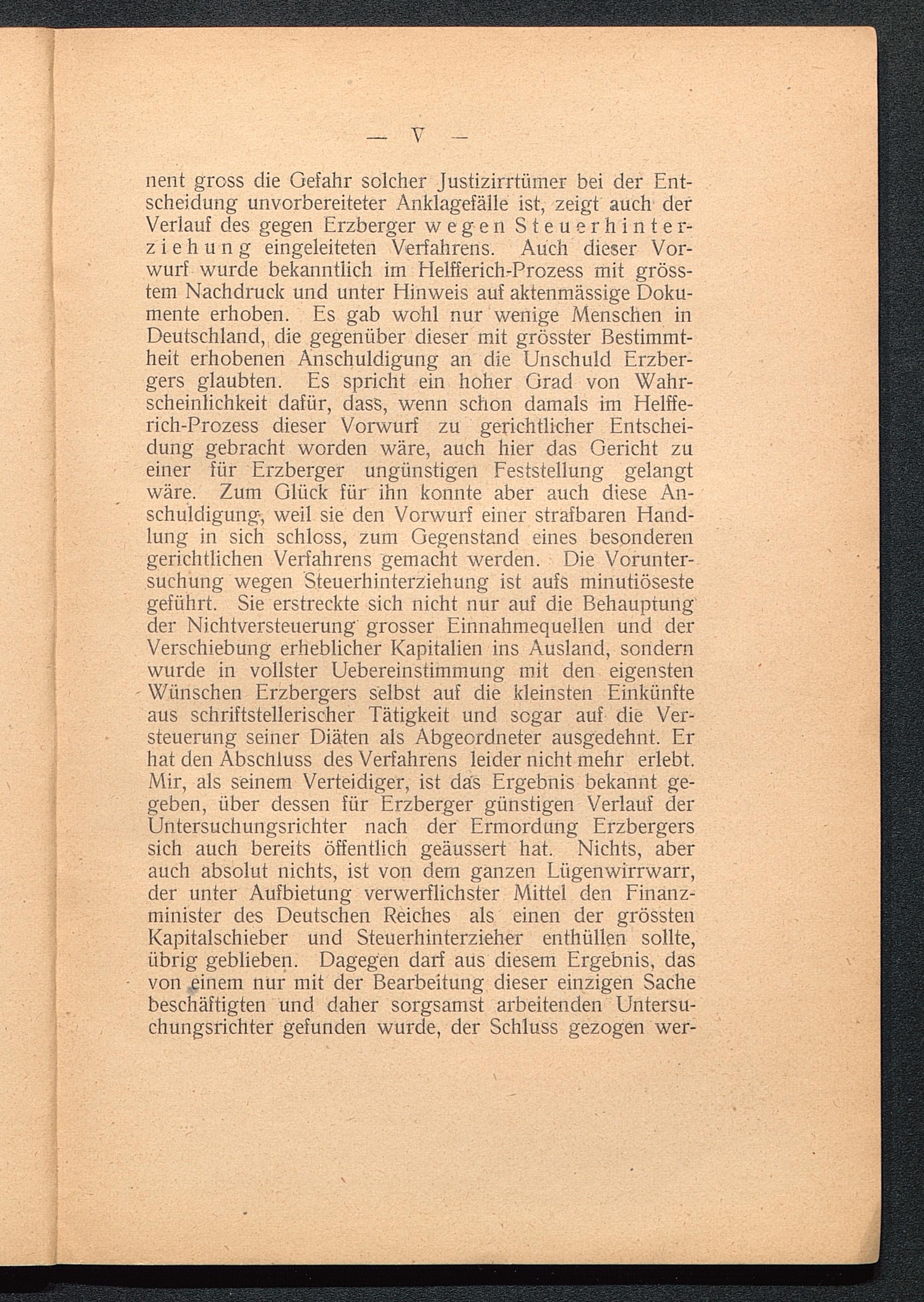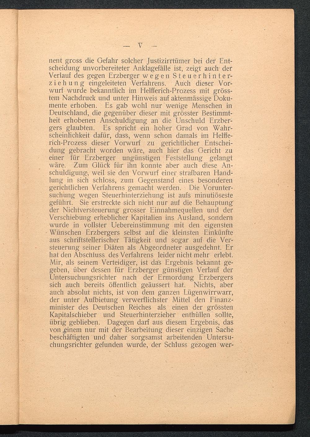 nent gross die Gefahr solcher Justizirrtümer bei der Ent-scheidung unvorbereiteter Anklagefälle ist, zeigt auch derVerlauf des gegen Erzberger wegen Steuerhinter-ziehung eingeleiteten Verfahrens. Auch dieser Vor-wurf wurde bekanntlich im Helfferich-Prozess mit gröss-tem Nachdruck und unter Hinweis auf aktenmässige Doku-mente erhoben. Es gab wohl nur wenige Menschen inDeutschland , die gegenüber dieser mit grösster Bestimmt-heit erhobenen Anschuldigung an die Unschuld Erzber-gers glaubten. Es spricht ein hoher Grad von Wahr-scheinlichkeit dafür, dass, wenn schon damals im Helffe-rich-Prozess dieser Vorwurf zu gerichtlicher Entschei-dung gebracht worden wäre, auch hier das Gericht zueiner für Erzberger ungünstigen Feststellung gelangtwäre. Zum Glück für ihn konnte aber auch diese An-schuldigung, weil sie den Vorwurf einer strafbaren Hand-lung in sich schloss, zum Gegenstand eines besonderengerichtlichen Verfahrens gemacht werden. Die Vorunter-suchung wegen Steuerhinterziehung ist aufs minutiösestegeführt. Sie erstreckte sich nicht nur auf die Behauptungder NichtVersteuerung grosser Einnahmequellen und derVerschiebung erheblicher Kapitalien ins Ausland, sondernwurde in vollster Uebereinstimmung mit den eigenstenWünschen Erzbergers selbst auf die kleinsten Einkünfteaus schriftstellerischer Tätigkeit und sogar auf die Ver-steuerung seiner Diäten als Abgeordneter ausgedehnt. Erhat den Abschluss des Verfahrens leider nicht mehr erlebt.Mir, als seinem Verteidiger, ist das Ergebnis bekannt ge-geben, über dessen für Erzberger günstigen Verlauf derUntersuchungsrichter nach der Ermordung Erzbergerssich auch bereits öffentlich geäussert hat. Nichts, aberauch absolut nichts, ist von dem ganzen Lügenwirrwarr,der unter Aufbietung verwerflichster Mittel den Finanz-minister des Deutschen Reiches als einen der grösstenKapitalschieber und Steuerhinterzieher enthüllen sollte,übrig geblieben. Dagegen darf aus diesem Ergebnis, dasvon .einem nur mit der Bearbeitung dieser einzigen Sachebeschäftigten und daher sorgsamst arbeitenden Untersu-chungsrichter gefunden wurde, der Schluss gezogen wer-