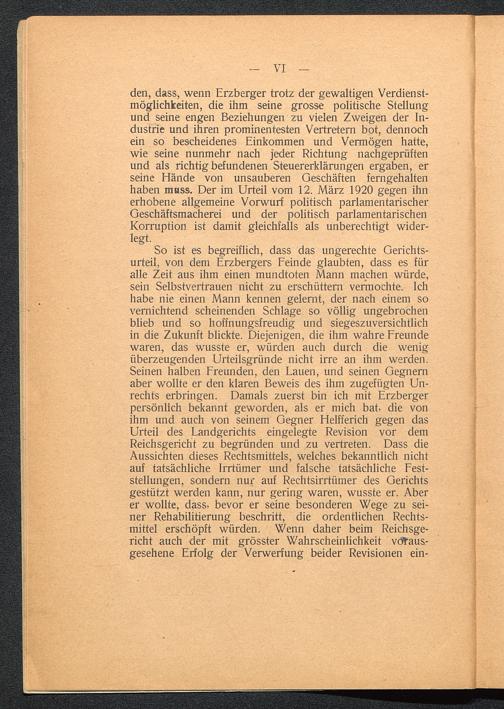 den, dass, wenn Erzberger trotz der gewaltigen Verdienst-möglichkeiten, die ihm seine grosse politische Stellungund seine engen Beziehungen zu vielen Zweigen der In-dustrie und ihren prominentesten Vertretern bot, dennochein so bescheidenes Einkommen und Vermögen hatte,wie seine nunmehr nach jeder Richtung nachgeprüftenund als richtig befundenen Steuererklärungen ergaben, erseine Hände von unsauberen Geschäften ferngehaltenhaben muss. Der im Urteil vom 12. März 1920 gegen ihnerhobene allgemeine Vorwurf politisch parlamentarischerGeschäftsmacherei und der politisch parlamentarischenKorruption ist damit gleichfalls als unberechtigt wider-legt.