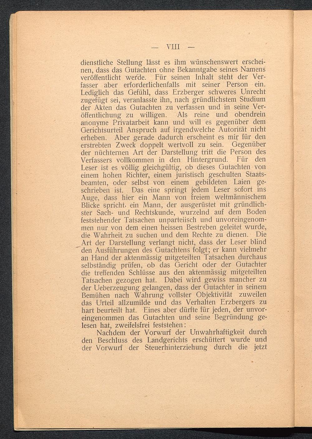 dienstliche Stellung lässt es ihm wünschenswert erschei-nen, dass das Outachten ohne Bekanntgabe seines Namensveröffentlicht wef'de. Für seinen Inhalt steht der Ver-fasser aber erforderlichenfalls mit seiner Person ein.Lediglich das Gefühl, dass Erzberger schweres Unrechtzugefügt sei, veranlasste ihn, nach gründlichstem Studiumder Akten das Gutachten zu verfassen und in seine Ver-öffentlichung zu willigen. Als reine und obendreinanonyme Privatarbeit kann und will es gegenüber demGerichtsurteil Anspruch auf irgendwelche Autorität nichterheben. Aber gerade dadurch erscheint es mir für denerstrebten Zweck doppelt wertvoll zu sein. Gegenüberder nüchternen Art der Darstellung tritt die Person desVerfassers vollkommen in den Hintergrund. Für denLeser ist es völlig gleichgültig, ob dieses Gutachten voneinem hohen Richter, einem juristisch geschulten Staats-beamten, oder selbst von einem gebildeten Laien ge-schrieben ist. Das eine springt jedem Leser sofort insAuge, dass hier ein Mann von freiem weltmännischemBlicke spricht, ein Mann, der ausgerüstet mit gründlich-ster Sach- und Rechtskunde, wurzelnd auf dem Bodenfeststehender Tatsachen unparteiisch und unvoreingenom-men nur von dem einen heissen Bestreben geleitet wurde,die Wahrheit, zu suchen und dem Rechte zu dienen. DieArt der Darstellung verlangt nicht, dass der Leser blindden Ausführungen des Gutachtens folgt; er kann vielmehran Hand der aktenmässig mitgeteilten Tatsachen durchausselbständig prüfen, ob das Gericht oder der Gutachterdie treffenden Schlüsse aus den aktenmässig mitgeteiltenTatsachen gezogen hat. Dabei wird gewiss mancher zuder Ueberzeugung gelangen, dass der Gutachter in seinemBemühen nach Wahrung vollster Objektivität zuweilendas Urteil allzumilde und das Verhalten Erzbergers zuhart beurteilt hat. Eines aber dürfte für jeden, der unvor-eingenommen das Gutachten und seine Begründung ge-lesen hat, zweifelsfrei feststehen: