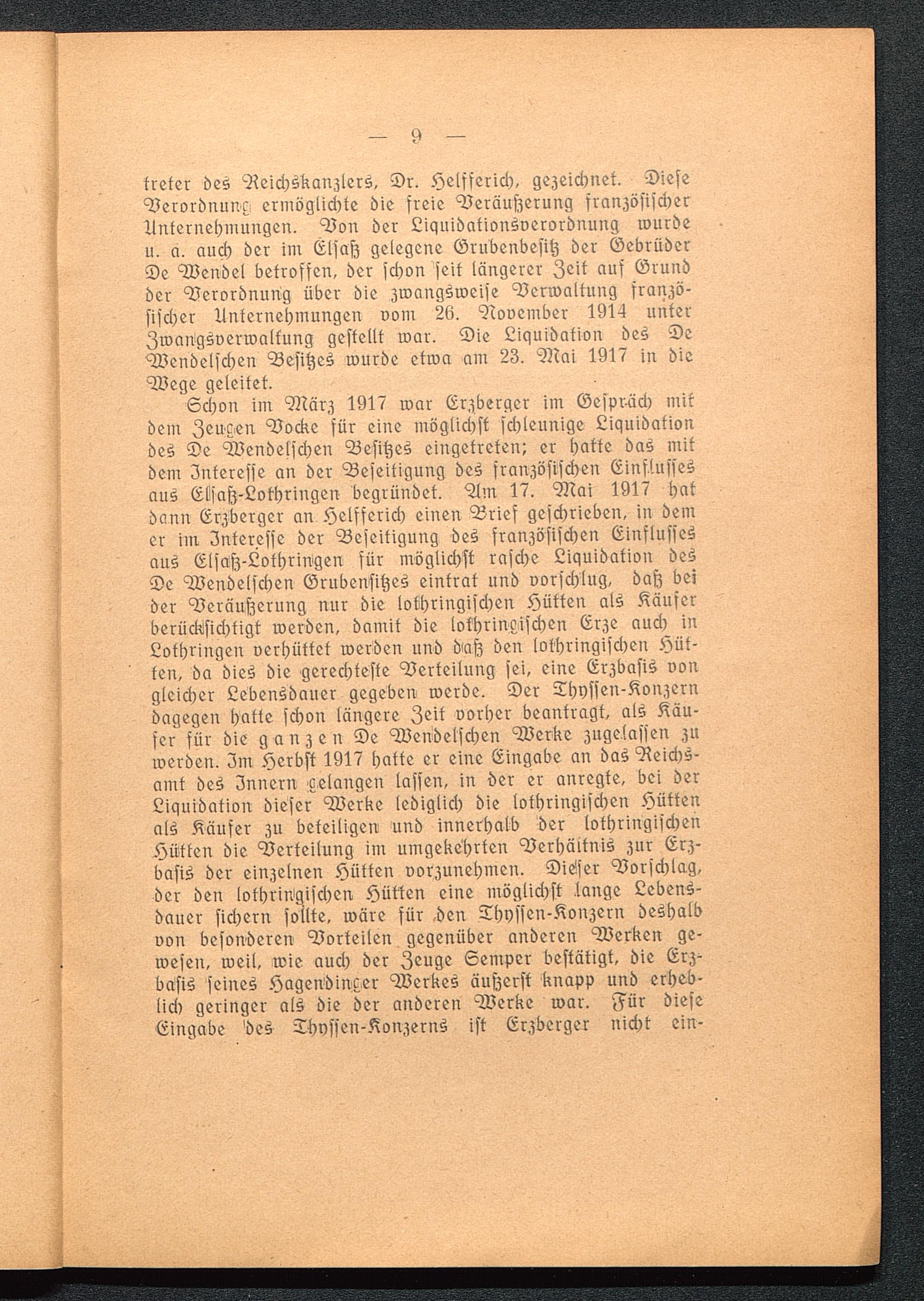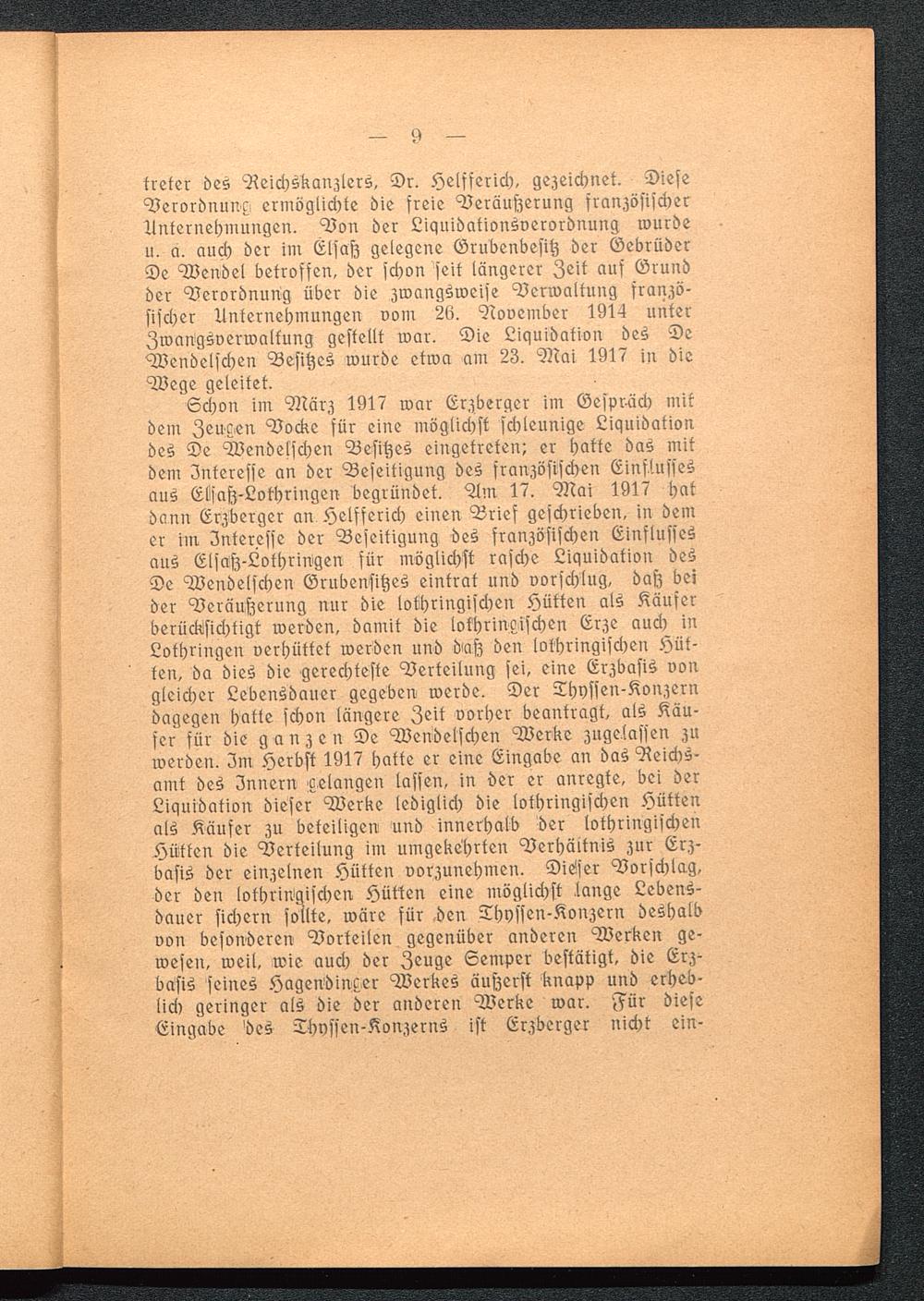 Schon im März 1917 war Erzberger im Gespräch mitdem Zeugen Vocke für eine möglichst schleunige Liquidationdes De Wendelschen Besitzes eingetreten: er hatte das mitdem Interesse an der Beseitigung des französischen Einflussesaus Elsafz-Lothringen begründet. Äm 17. Mai 1917 hatdann Erzberger an Helfserich einen Brief geschrieben, in demer im Interesse der Beseitigung des französischen Einflussesaus Elsaß-Lothringen für möglichst rasche Liquidation desDe Wendelschen Grubensitzes eintrat und vorschlug, dasz bezder Veräußerung nur die lothringischen Hütten als Käuferberücksichtigt werden, damit die lothringischen Erze auch inLothringen verhüttet werden und dlaß den lothringischen Hüt-ten, da dies die gerechteste Verteilung sei, eine Erzbasis vongleicher Lebensdauer gegeben werde. Der Thyssen-Konzerndagegen hatte schon längere Zeit vorher beantragt, als Käu-fer für die ganzen De Wendelschen Werke zugelassen zuwerden. Im Herbst 1917 hatte er eine Eingabe an das Reichs-amt des Innern gelangen lassen, in oer er anregte, bei derLiquidation dieser Werke lediglich die lothringischen Hüttenals Käufer zu beteiligen und innerhalb der lothringischenHütten die Verteilung im umgekehrten Verhältnis zur Erz-basis der einzelnen Hütten vorzunehmen. Dieiser Vorschlag,der den lothringischen Hütten eine möglichst lange Lebens-dauer sichern sollte, wäre für.den Thyssen-Konzern deshalbvon besonderen Vorteilen gegenüber anderen Werken ge-wesen, weil, wie auch der Zeuge Cemper bestätigt, die Erz-basis seines Hagendincer Werkes äußerst knapp und erheb-lich geringer als die der anderen Werke war. Für dieseEingabe "des Thyssen-Konzerns ist Erzberger nicht ein-