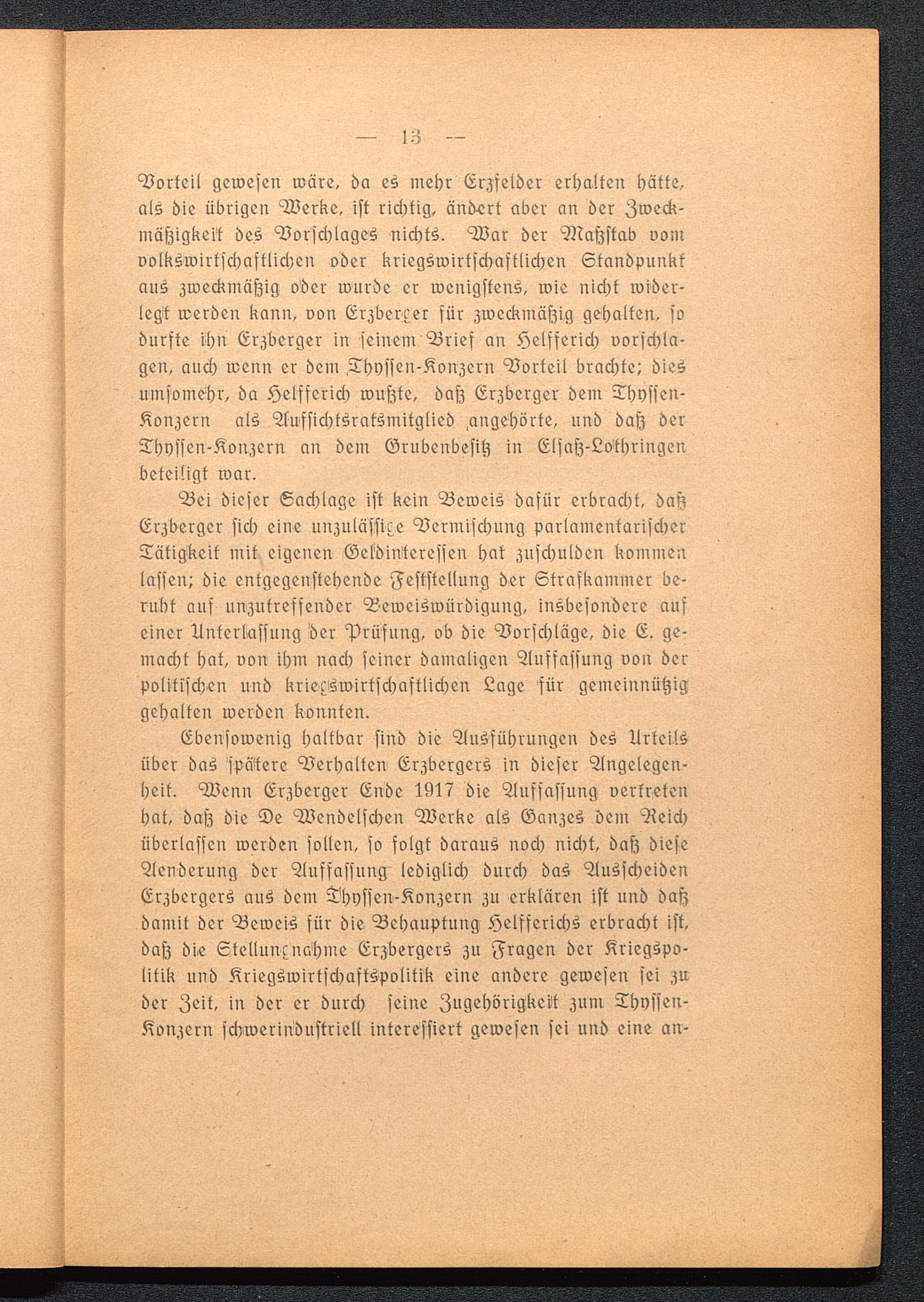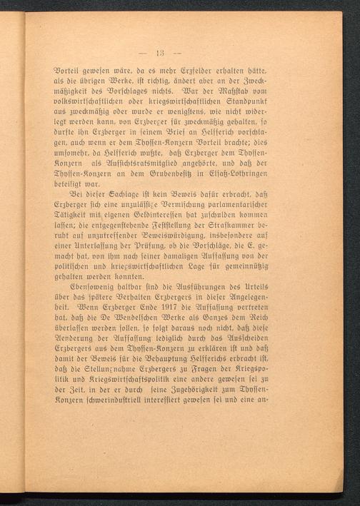 Ebensowenig haltbar sind die Ausführungen des Urteilsüber das spMere Verhalten Erzbergers in dieser Angelegen-heit. Wenn Erzberger Ende 1917 die Auffassung vertretenhat, daß die De Wendelschen Werke als Ganzes dem Reichüberlassen werden sollen, so folgt daraus noch nicht, daß dieseAenderung der Auffassung lediglich durch das AusscheidenErzbergers aus dem Thyssen-Konzern zu erklären ist und daßdamit der Beweis für die Behauptung Helfferichs erbracht ist,daß die Stelluncnahme Erzbergers zu Fragen der Kriegspo-litik und Kriegswirtschaftspolitik eine andere gewesen sei zuder Zeit, in der er durch seine Zugehörigkeit zum Thyssen-Konzern schwerindustriell interessiert gewesen sei und eine an-