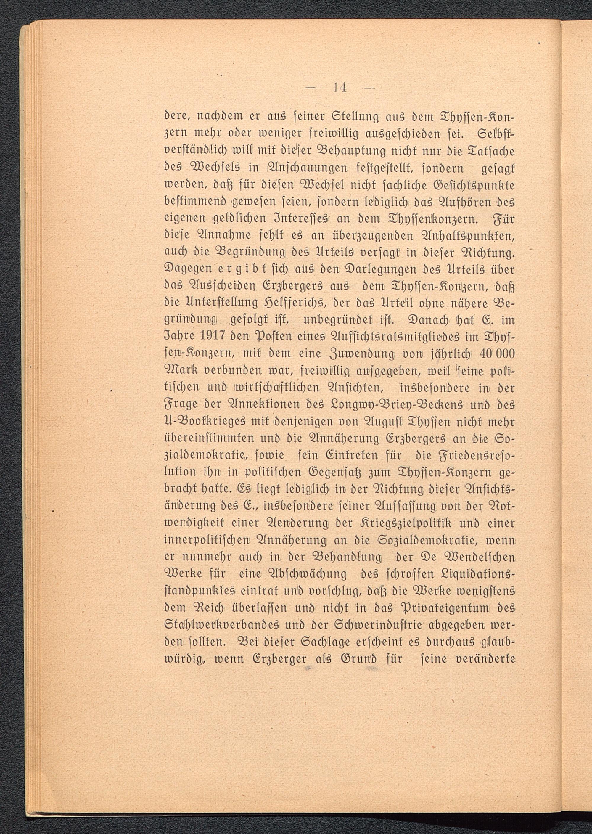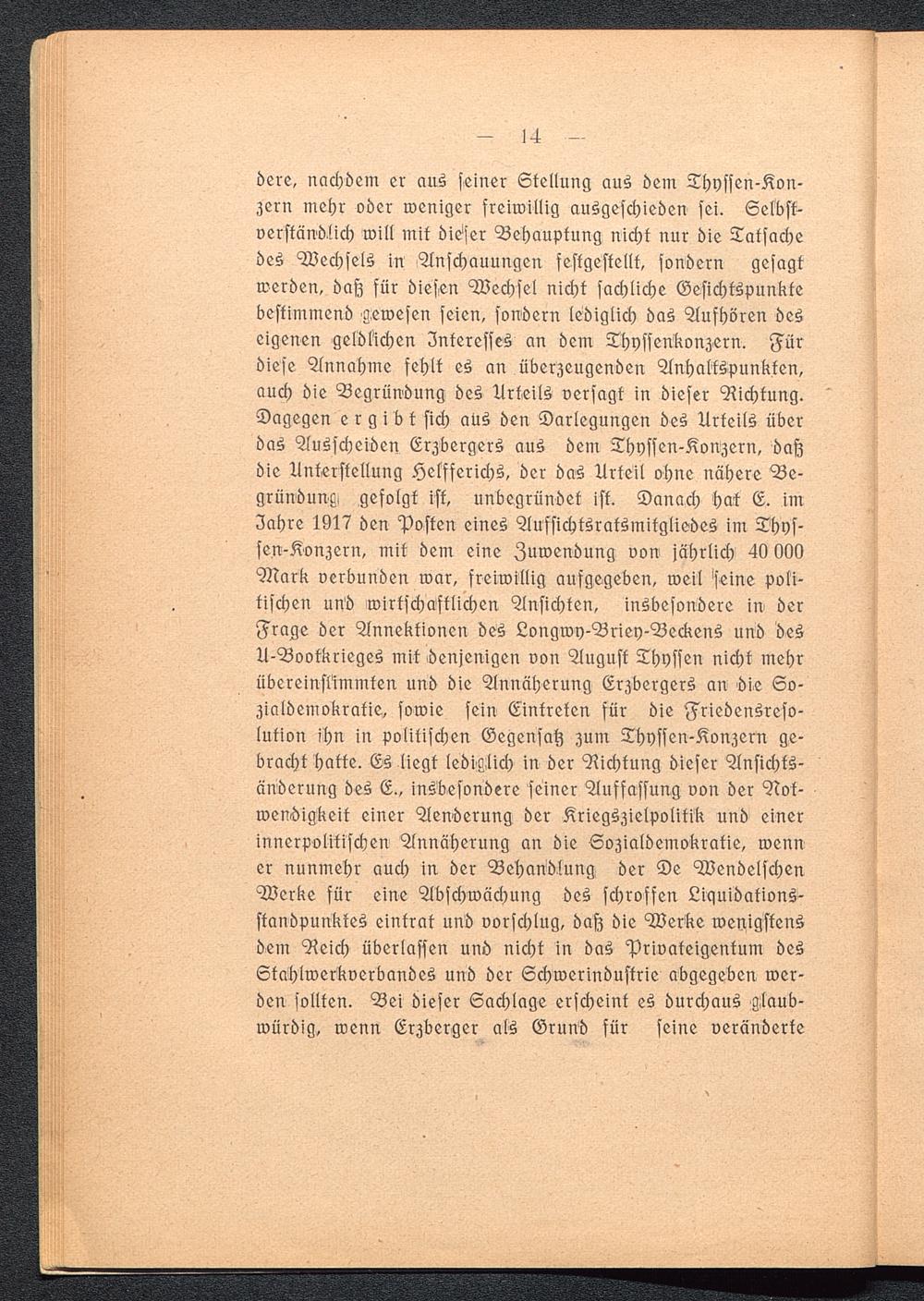 dere, nachdem er aus seiner Stellung aus dem Thyssen-Kon-zern mehr oder weniger freiwillig ausgeschieden sei. Selbst-verständlich will mit dieser Behauptung nicht nur die Tatsachedes Wechsels in Anschauungen festgestellt, sondern gesagtwerden, daß für diesen Wechsel nicht sachliche Gesichtspunktebestimmend gewesen seien, sondern lediglich das Aufhören deseigenen geldlichen Interesses an dem Thyssenkonzern. Fürdiese Annahme fehlt es an überzeugenden Anhaltspunkten,auch die Begründung des Urteils versagt in dieser Richtung.Dagegen e r g i b t sich aus den Darlegungen des Urteils überdas Ausscheiden Erzbergers aus dem Thyssen-Konzern, daßdie Unterstellung Helfferichs, der das Urteil ohne nähere Be-gründung gefolgt ist, unbegründet ist. Danach hat E. imZahre 1917 den Posten eines Aufsichtsraksmitgliedes im Thys-sen-Konzern, mit dem eine Zuwendung von jährlich 40 (MMark verbunden war, freiwillig aufgegeben, weil 'seine poli-tischen uttd wirtschaftlichen Ansichten, insbesondere iu derFrage der Annektionen des Longroy-Briey-Beckens und desU-Bootkrieges mit denjenigen von August Thyssen nicht mehrübereinstimmten und die Annäherung Erzbergers an die So-zialdemokratie, sowie sein Eintreten für die Friedensreso-lution ihn in politischen Gegensatz zum Thyssen-Konzern ge-bracht hatte. Es liegt lediglich in der Richtung dieser Ansichts-änderung des E., insbesondere seiner Auffassung von der Not-wendigkeit einer Aenderung der Kriegszielpolitik und einerinnerpolitischen Annäherung an die Sozialdemokratie, wenner nunmehr auch in der Behandlung der De WendelschenWerke für eine Abschwächung des schroffen Liquidations-standpunktes eintrat und vorschlug, daß die Werke wenigstensdem Reich überlassen und nicht in das Privateigentum desStahlwerkverbandes und der Schwerindustrie abgegeben wer-den sollten. Bei dieser Sachlage erscheint es durchaus glaub-würdig, wenn Erzberger als Grund für seine veränderte
