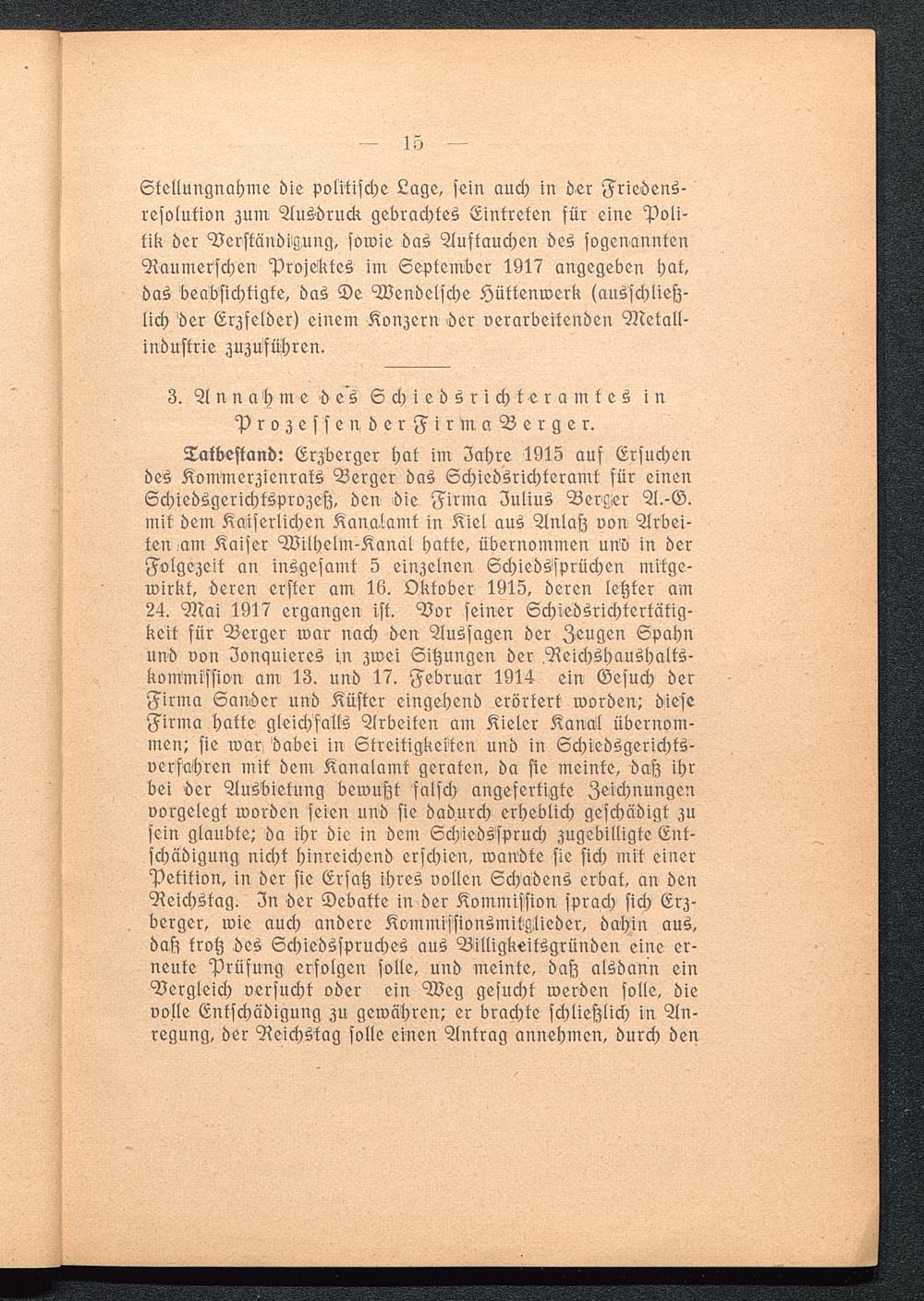 Takbestand: Erzberger hat im Jahre 1915 auf Ersuchendes Kommerzienrats Berger das Schiedsrichteramt für einenSchiedsgerichtsprozefz, den die Firma Julius Berber A.-G.mit dem Kaiserlichen Kanalamt in Kiel aus Anlafz von Arbei-ten am Kaiser Wilhelm-Kanal hatte, übernommen unv in derFolgezeit an insgesamt 3 einzelnen Schiedssprüchen mitge-wirkt, deren erster am 16. Oktober 1915, deren letzter am24. Mai 1917 ergangen ist. Vor seiner Schiedsrichtertätig-keit für Berger war nach den Aussagen der Zeugen Spähnund von Ionquieres in zwei Sitzungen der,Reichshaushalts-Kommission am 13. und 17. Februar 1914 ein Gesuch derFirma Sanier und Küster eingehend erörtert worden; dieseFirma hakte gleichfalls Arbeiten am Kieler Kanal übernom-men; sie war Habei in Streitigkeiten und in Schiedsgerichts-verfahren mit dem Kanalamt geraten, da sie meinte, daß ihrbei der Ausbietung bewußt falsch angefertigte Zeichnungenvorgelegt worden seien und sie dadurch erheblich geschädigt zusein glaubte; da ihr die in dem Schiedsspruch zugebilligte Ent-schädigung nicht hinreichend erschien, wandte sie sich mit einerPetition, in der sie Ersatz ihres vollen Schadens erbat, an denReichstag . Zn der Debatte in der Kommission, sprach sich Erz-berger, wie auch andere Kommissionsmitglieder, dahin aus,daß trotz des Schiedsspruches aus Billigkeitsgründen eine er-neute Prüfung erfolgen solle, und meinte, daß alsdann einVergleich versucht oder ein Weg gesucht werden solle, dievolle Entschädigung zu gewähren; er brachte schließlich in An-regung, der Reichstag solle einen Antrag annehmen, durch den