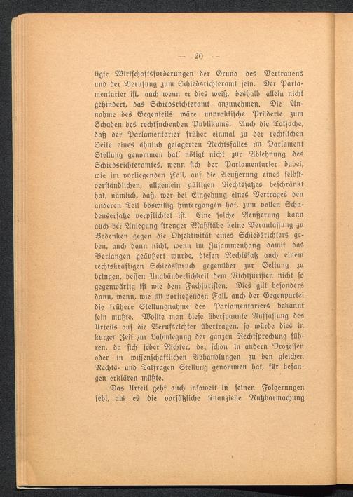 tigte Wirtschaftsforderungen der Grund des Vertrauensund der Berufung Zum Echiedsrichteramt sein. Der Parla-mentarier ist, auch wenn er dies weiß, deshalb allein nichtgehindert, das Schiedsrichteramt anzunehmen. Die An-nahme des Gegenteils wäre unpraktische Prüderie zumSchaden des rechksuchenden Publikums. Auch die Tatsache,daß der Parlamentarier früher einmal zu der rechtlichenSeite eines ähnlich gelagerten Rechtsfalles im ParlamentStellung genommen hat,' nötigt nicht zur Ablehnung öesSchiedsrichteramtes, wenn sich der Parlamentarier dabei,wie im vorliegenden Fall, auf die Aeußerung eines selbst-verständlichen, allgemein gültigen Rechtssatzes beschränkthat, nämlich, daß, wer bei Eingehung eines Vertrages denanderen Teil böswillig hintergangen hat, zum vollen Scha-densersätze verpflichtet ist. Eine folche Aeußerung kannauch bei Anlegung strenger Maßstäbe keine Veranlassung zuBedenken gegen die Objektivität eines Schiedsrichters ge-den, auch dann nicht, wenn im Zusammenhang damit dasVerlangen geäußert wurde, diesen Rechts'sah auch einemrechtskräftigen Schiedsspruch gegenüber zur Geltung zubringen, dessen Unabänderlichkeit dem Nichtjuristen nicht sogegenwärtig ist wie dem Fachjuristen. Dies gilt besondersdann, wenn, wie im vorliegenden Fall, auch der Gegenparteidie frühere Stellungnahme des Parlamentariers bekanntsein mußte. Wollte man diese überspannte Auffassung desUrteils auf die Berufsrichter übertragen, so würde dies inkurzer Zeit zur Lahmlegung der ganzen Rechtsprechung füh-ren, da sich jeder Richter, der schon in andern Prozessenoder in wissenschaftlichen Abhandlungen zu den gleichenRechts- und Tatfragen Stellung genommen hat, für befan-gen erklären müßte.