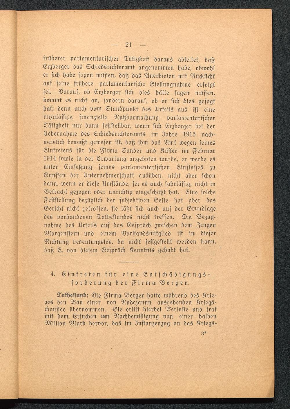 früherer parlamentarischer Tätigkeit daraus ableitet, daszErzberger das Echiedsrichteramt angenommen habe, obwohler sich habe sagen müssen, dasz das Anerbieten mit Rücksichtauf seine frühere parlamentarische Stellungnahme erfolgtsei. Darauf, ob Erzberger sich dies hätte sagen müssen,kommt es nicht an, sondern darauf, ob er sich >dies gesagthat: denn auch vom Standpunkt des Urteils aus ist eineunzulässige finanzielle Nutzbarmachung parlamentarischerTätigkeit nur dann feststellbar, wenn sich Erzberger bei derUebernahme des Schiedsrichteramts im Zahre 1913 nach-weislich bewußt gewesen ist, daß ihm das Amt wegen seinesEintretens für die Firma Sander und Küster im Februar1914 sowie in der Erwartung angeboten wurde, er werde esunter Einsetzung feines parlamentarischen Einflusses zuGunsten der Unternehmerschaft ausüben, nicht aber schondann, wenn er diese Umstände, sei es auch fahrlässig, nicht inBetracht gezogen oder unrichtig eingeschätzt hat. Eine solcheFeststellung bezüglich der subjektiven Seite hat aber dasGericht nicht cetroffen, sie läßt sich auch auf der Grundlagedes vorhandenen Tatbestandes nicht treffen. Die Bezug-nahme des Urteils auf das Gespräch zwischen dem ZeugenMorgenstern und einem Vorstandsmitglied ist in dieserRichtung bedeutungslos, da nicht festgestellt werden kann,daß E. von diesem Gespräch Kenntnis gehabt hak.