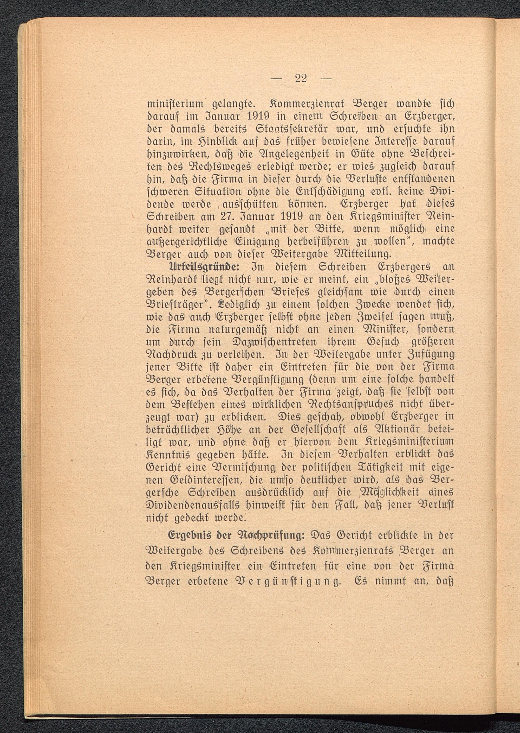 Urleilsgründe: Zn diesem Schreiben Erzbergers anReinhardt liegt nicht nur, wie er meint, ein «bloßes Wetter-geben des Berger^schen Briefes gleichsam wie durch einenBriefträger". Lediglich zu einem solchen Zwecke wendet sich,wie das auch Erzberger selbst ohne jeden Zweifel sagen muß,öie Firma naturgemäß nicht an einen Minister, sondernum durch sein Dazwischentreten ihrem Gesuch größerenRachdruck zu verleihen. Zn der Weitergabe unter Zufügungjener Bitte ist daher ein Eintreten für die von der FirmaBerger erbetene Vergünstigung (denn um eine solche handeltes sich, >da das Verhalten der Firma zeigt, >daß sie selbst vondem Bestehen eines wirklichen Rechtsanspruches nicht über-zeugt war) zu erblicken. Dies geschah, obwohl Erzberger inbeträchtlicher Höhe an der Gesellschaft als Aktionär betei-ligt war, und ohne daß er hiervon dem KriegsminisieriumKenntnis gegeben hätte. Zn diesem Verhalten erblickt dasGericht eine Vermischung der politischen Tätigkeit mit eige-nen Geldinkeressen, die um^so deutlicher wird, als ldas Ber-gersche Schreiben ausdrücklich auf die Möglichkeit ciinesDiviiden'denausfalls hinweist für den Fall, daß jener Verlustnicht gedeckt werde.