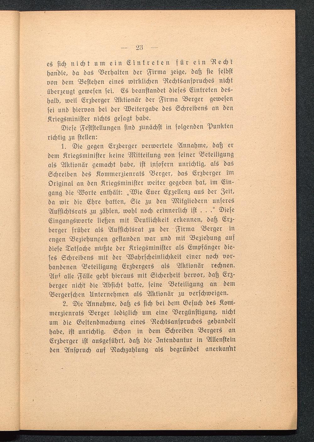 1. Die gegen Erzberger verwertete Annahme, daß erdem Kriegsminister keine Mitteilung von seiner Beteiligungals Aktionär gemacht habe, ist insofern unrichtig, als dasSchreiben des Kommerzienrats Berger, das Erzberger MOriginal an den Kriegsminister weiter gegeben hat, im Ein-gang die Worte enthält: «Wie Euer Exzellenz aus der Zeit,da wir die Ehre hatten, Sie zu den Mitgliedern unseresAufsichtsrats zu zählen, wohl noch erinnerlich ist . . ." DieseEingangsworte ließen mit Deutlichkeit erkennen, daß Erz-berger früher als Aufsichtsrat zu der Firma Berger inengen Beziehungen gestanden war und mit Beziehung aufdiese Thatsache m>ufzte der Kriegsminister als Empfänger die-ses Schreibens mit der Wahrscheinlichkeit einer noch vor-handenen Beteiligung Erzbergers als Aktionär rechnen.Aus alle Fälle geht hieraus mit Sicherheit hervor, daß Erz-berger nicht die Absicht hatte, seine Beteiligung an demBergerschen Unternehmen als Aktionär zu verschweigen.