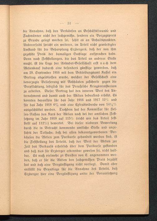 die Annahme, daß den Verkäufen an Geschäftsfreunde undFachmänner nicht der fachgemäße, sondern ein Vorzugspreiszu Grunde gelegt worden sei, fehlt es an Anhaltspunkten.Andererseits spricht ein weiterer, im Urteil nicht gewürdigterUmstand für die Behauptung Erzbergers, daß der von ihmgezahhke Preis der damaligen Sachlage entsprochen habe.Denn nach Feststellungen, die das Urteil an anderer Stellemacht, ist die Lage der Anhydat-Gesellschaft erst nach demAktienkauf dadurch eine besonders günstige geworden, daßam 29. September 1916 mit dem Bekleidungsamt Kassel einBertrag abgeschlossen wurde, welcher der Gesellschaft einebevorzugte Belieferung mit Rohhäuten zusicherte gegen dieVerpflichtung, lediglich für das Preußische Kriegsmimsteriumzu arbeiten. Dieser Vertrag hat den inneren Wert des Un-ternehmens und damit auch der Aktien bedeukend erhöht. Eskonnten daraufhin für das Zahr 1916 und 1917 12A undfür das Zahr 1918 6^ und eine Extradividende von 14^^ausgeschüttet werden. Trotzdem hat der Kommissar für Hef-sen-Nassau den Kurs der Aktien noch bei der amtlichen Fest-setzung im Zahr 1919 auf 115-)? (nicht wie das Urteil fest-stellt auf 112A-) bewerket. Bei dieser niederen Bewertungdurch die in Betracht kommende amtliche Stelle und anoe-sichts der Tatsache, daß bei allen bekanntgewordenen Ver-Käufen die Aktien zum Parikurse gehandelt worden sind, istdie Feststellung des Urteils, daß der Wert der Aktien zurZeit des Verkaufs erheblich über dem Parikurse gestandenund daß dies für Erzberger erkennbar gewesen sei, nicht halt-bar. Es muß vielmehr zu Gunsten von E. angenommen wer-den, daß er für die Aktien den sachgemäßen Preis bezahlthat und daß eine Vergünstigung nicht vorliegt. Damit aberentfällt die Grundlage für die Annahme des Urteils, daßErzberger hier eine Vergünstigung unter der Voraussetzung