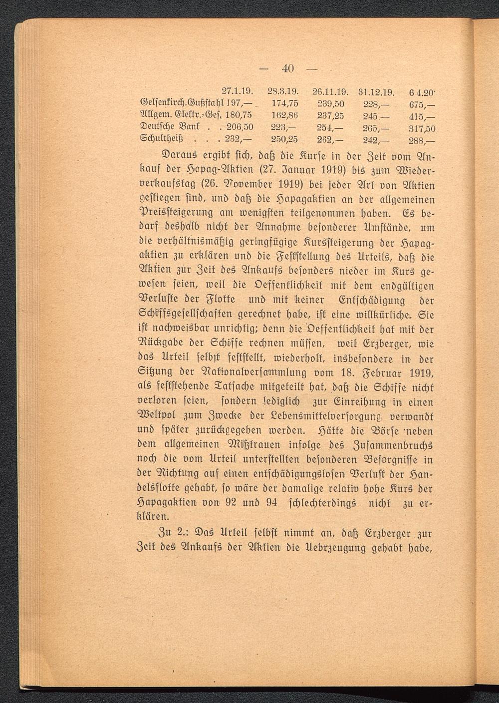 Daraus ergibt sich, dasz die Kurse in der Zeit vom An-kauf der Hapag -Aktien (27. Januar 1919) bis zum Wieder-verkaufstag (26. November 1919) bei jeder Art von Aktiengestiegen sind, und daß die Hapagaktien an der allgemeinenPreissteigerung am wenigsten keilgenommen haben. Es be-darf desha'lb nicht der Annahme besonderer Umstände, umdie verhältnismäßig geringfügige Kurssteigerung der Hapag -aktien zu erklären und die Feststellung des Urteils, daß dieAktien zur Zeit des Ankaufs besonders nieder im Kurs ge-wesen seien, weil die Öffentlichkeit mit dem endgültigenVerluste der Flotte und mit keiner Entschädigung derSchliffsgesellschaften gerechnet habe, ist eine willkürliche.. Sieist nachweisbar unrichtig! denn die Öffentlichkeit hat mit derRückgabe der Schiffe rechnen müssen, weil Erzberger, wiedas Urteil selbst feststellt, wiederholt, insbesondere in derSitzung der Nationalversammlung vom 18. Februar 1919,als feststehende Tatsache mitgeteilt hat, daß die Schiffe nichtverloren seien, sondern lediglich zur Einreihung in einenWeltpol zum Zwecke der Lebensmittelversorgung verwandtund später zurückgegeben werden. Hätte die Börse nebendem allgemeinen Mißtrauen infolge des Zusammenbruchsnoch die vom Urteil unterstellten besonderen Besorgnisse inder Richtung auf einen entschädigungslosen Verlust der Han-delsflotte gehabt, so wäre der damalige relativ hohe Kurs derHapagaktien von 92 und 94 schlechterdings nicht zu er-klären.