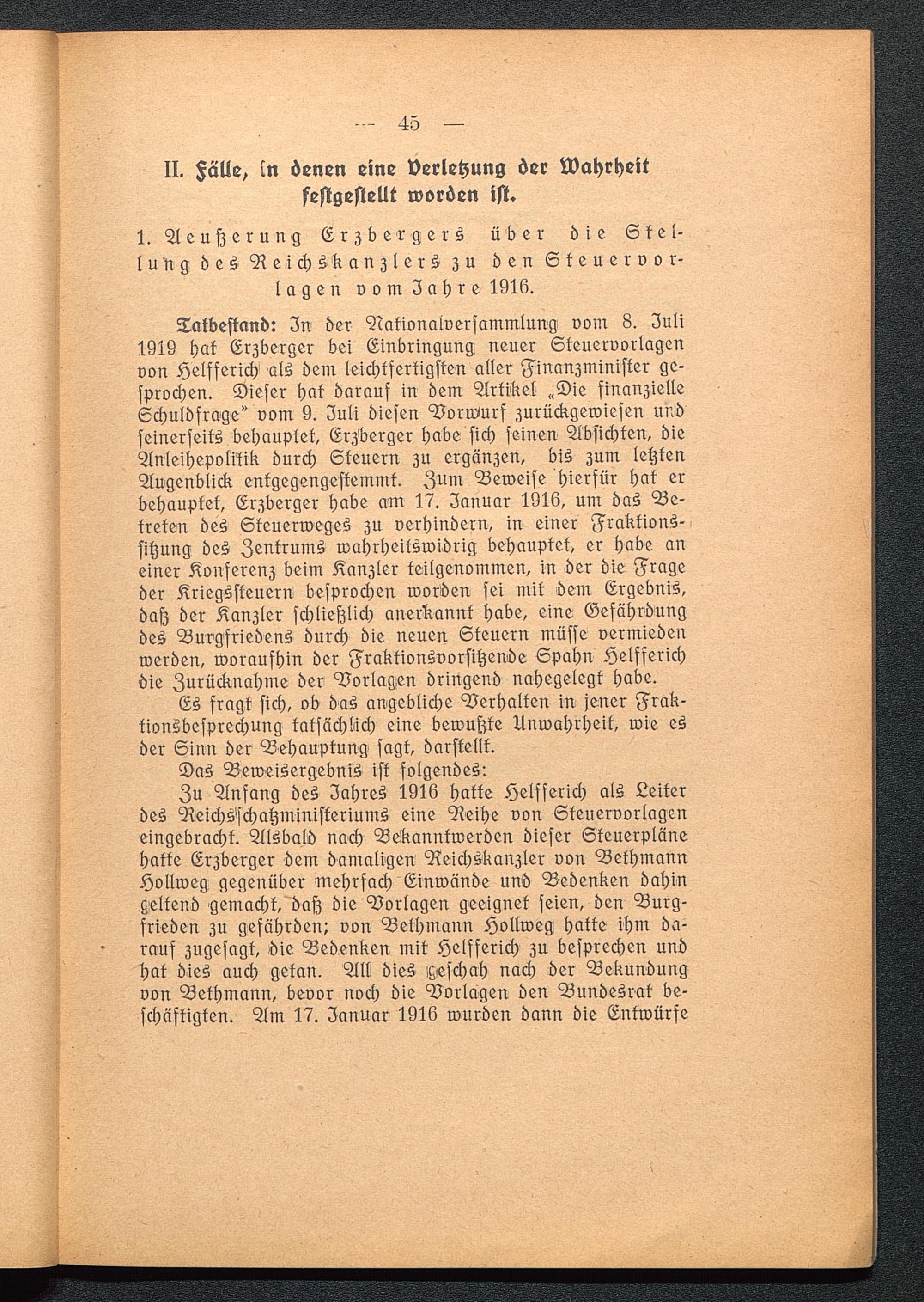 Zu Anfang des Jahres 1916 hatte Helfferich als Leiterdes Reichs^schatzministeriums eine Reihe von Steuervorlagcneingebracht. Alsbald nach Bekanntwerden dieser Skeuerplänehakte Erzberger dem damaligen Reichskanzler von BethmannHollweg gegenüber mehrfach Einwände und Bedenken dahingeltend gemacht, daß die Borlagen geeignet seien, den Burg-frieden zu gefährden; von Bethmann Hollweg hatte ihm da-rauf zugesagt, öie Bedenken mit Helfferich zu besprechen undhat dies auch getan. All dies geschah nach der Bekundungvon Bethmann, bevor noch die Borlagen den Bundesrat be-schäftigten. Am 17. Januar 1916 wurden dann die Entwürfe