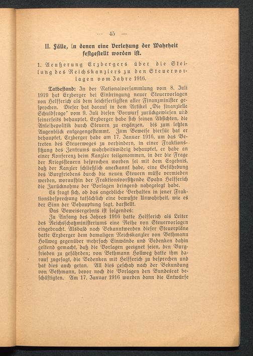 Takbestand: In der Nationalversammlung vom 8. Juli1919 hat Erzberger bei Einbringung neuer Steuervorlagenvon Helfferich als dem leichtfertigsten aller Finanzminister ge-sprochen. Dieser hat darauf in dem Artikel „Die finanzielleSchuldfrage" vom 9. Juli diesen Borwurf zurückgewiesen undseinerseits behauptet, Erzberger habe sich seinen Absichten, dieAnleihepolitik durch Steuern zu ergänzen, bis zum letztenAugenblick entgegengestemmt. Zum Beweise hierfür hat erbehauptet, Erzberger habe am 17. Januar 1916, um das Be-treten des Skeuerweges zu verhindern, in einer Fraktions-sitzung des Zentrums wahrheitswidrig behauptet, er habe aneiner Konferenz beim Kanzler teilgenommen, in der die Frageder Kriegssteuern besprochen worden sei mit dem Ergebnis,daß der Kanzler schließlich anerkannt habe, eine Gefährdungdes Burgfriedens durch die neuen Steuern müsse vermiedenwerden, woraufhin der Fraktionsvorsitzende Spähn Helfferichdie Zurücknahme der Borlagen dringend nahegelegt habe.
