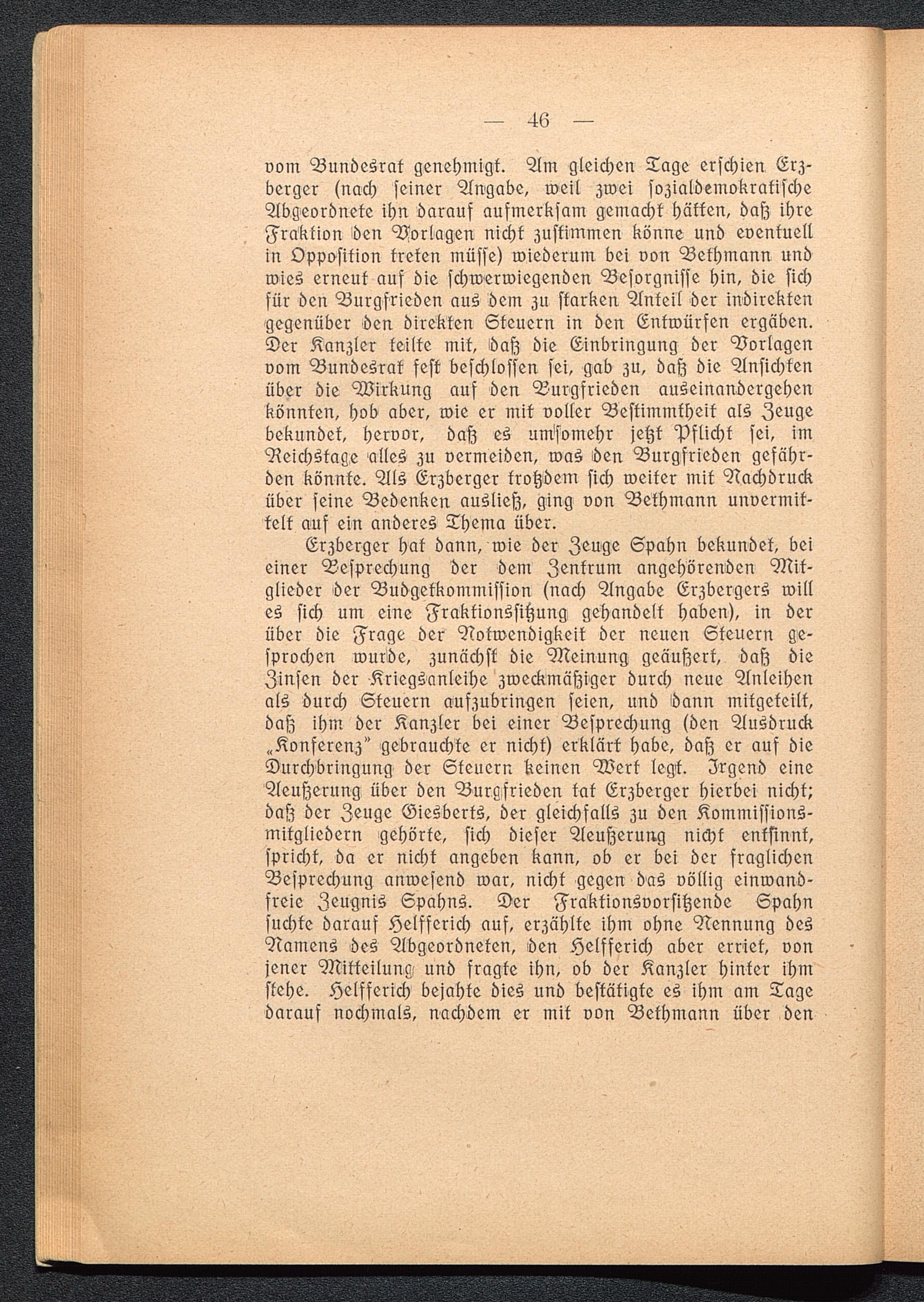 Erzberger hat dann, wie der Zeuge Spähn bekundet, beieiner Besprechung der dem Zentrum angehörenden Mit-glieder der Budgetkommission (nach Angabe Erzbergers willes sich um eine Fraktionssitzung gehandelt haben), in derüber die Frage der Notwendigkeit der neuen Steuern ge-sprochen wurde, zunächst die Meinung geäußert, daß dieZinsen der Kriegsanleihe zweckmäßiger durch neue Anleihenals durch Steuern aufzubringen seien, und Äann mitgeteilt,daß ihm der Kanzler bei einer Besprechung (den Ausdruck»Konferenz" gebrauchte er nicht) erklärt habe, daß er auf dieDurchdringung der Steuern keinen Wert legt. Argend eineAeußerung über den Burgfrieden tat Erzberger hierbei nicht)daß der Zeuge Giesberts, der gleichfalls zu den Kommissions-Mitgliedern gehörte, sich dieser Aeußerung nicht entsinnt,spricht, da er nicht angeben kann, ob er bei der fraglichenBesprechung anwesend war, nicht gegen das völlig einwand-freie Zeugnis Spahns. Der Fraktionsvorfitzende Spähnsuchte darauf Helfferich auf, erzählte ihm ohne Nennung desNamens des Abgeordneten, -den Helfferich aber erriet, vonjener Mitteilung- und fragte ihn, ob der Kanzler hinter ihmsiehe. Helfferich bejahte dies und bestätigte es ihm am Tagedarauf nochmals, nachdem er mit von Bethmann über den