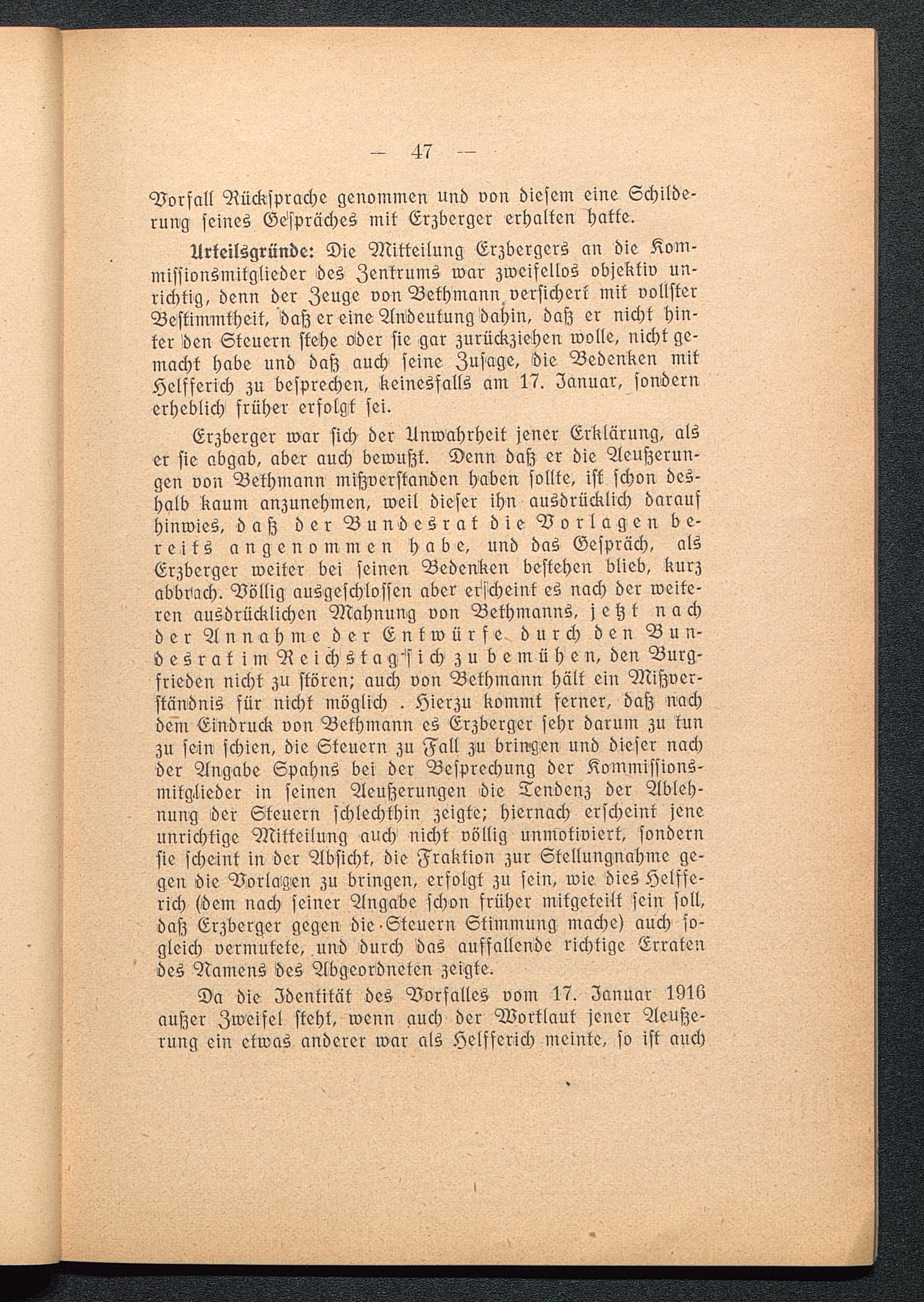 Urteilsgründe: Die Mitteilung Erzbergers an die Kom-missionsmikglieder des Zentrums war zweifellos objektiv un-richtig, denn der Zeuge von Bethmann, versichert mit vollsterBestimmtheit, daß er eine Andeutung dahin, daß er nicht hin-ter den Steuern stehe oder sie gar zurückziehen wolle, nicht ge-macht habe und daß auch seine Zusage, 'die Bedenken mitHelfferich zu besprechen, keinesfalls am 17. Januar, sondernerheblich früher erfolgt sei.