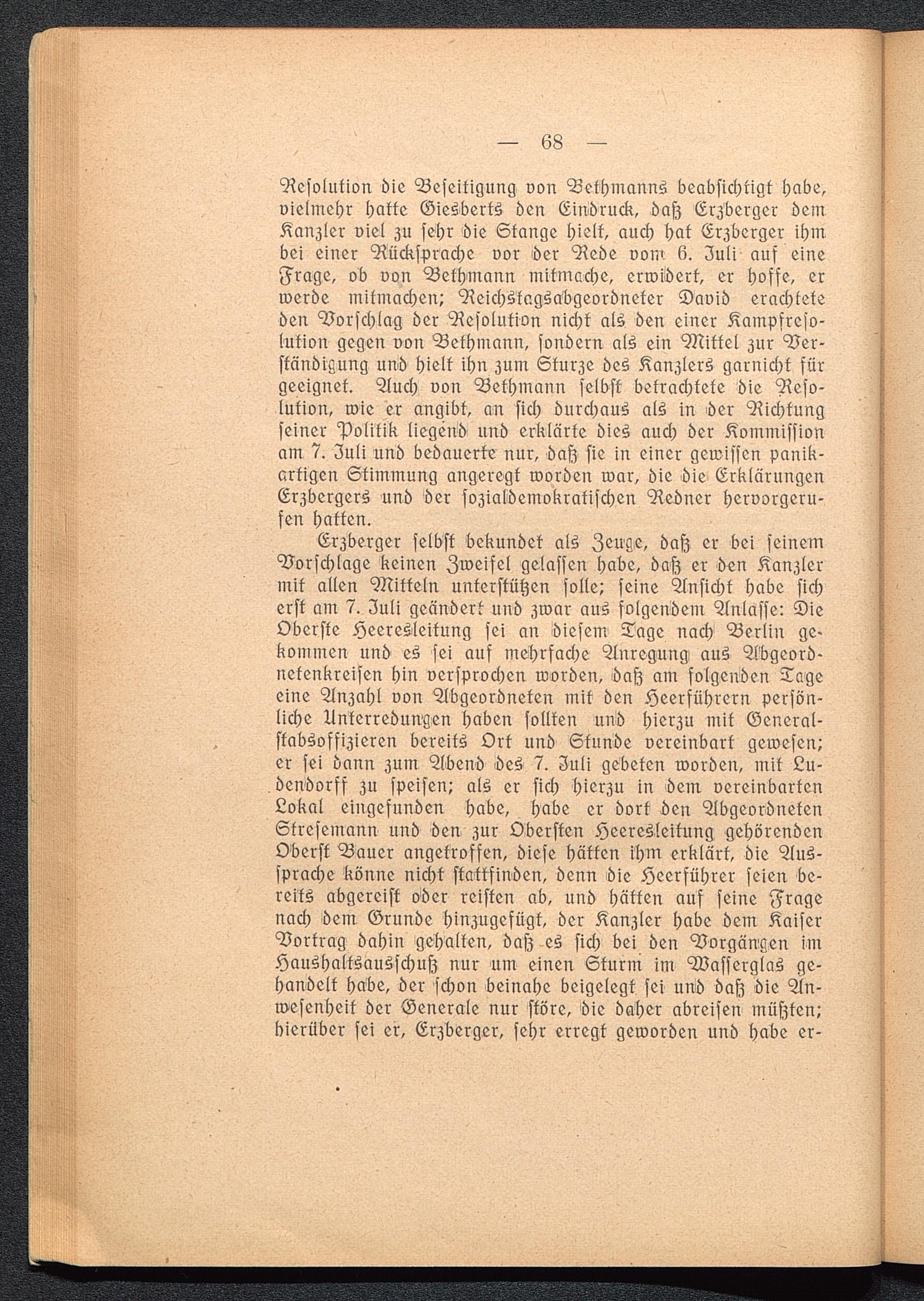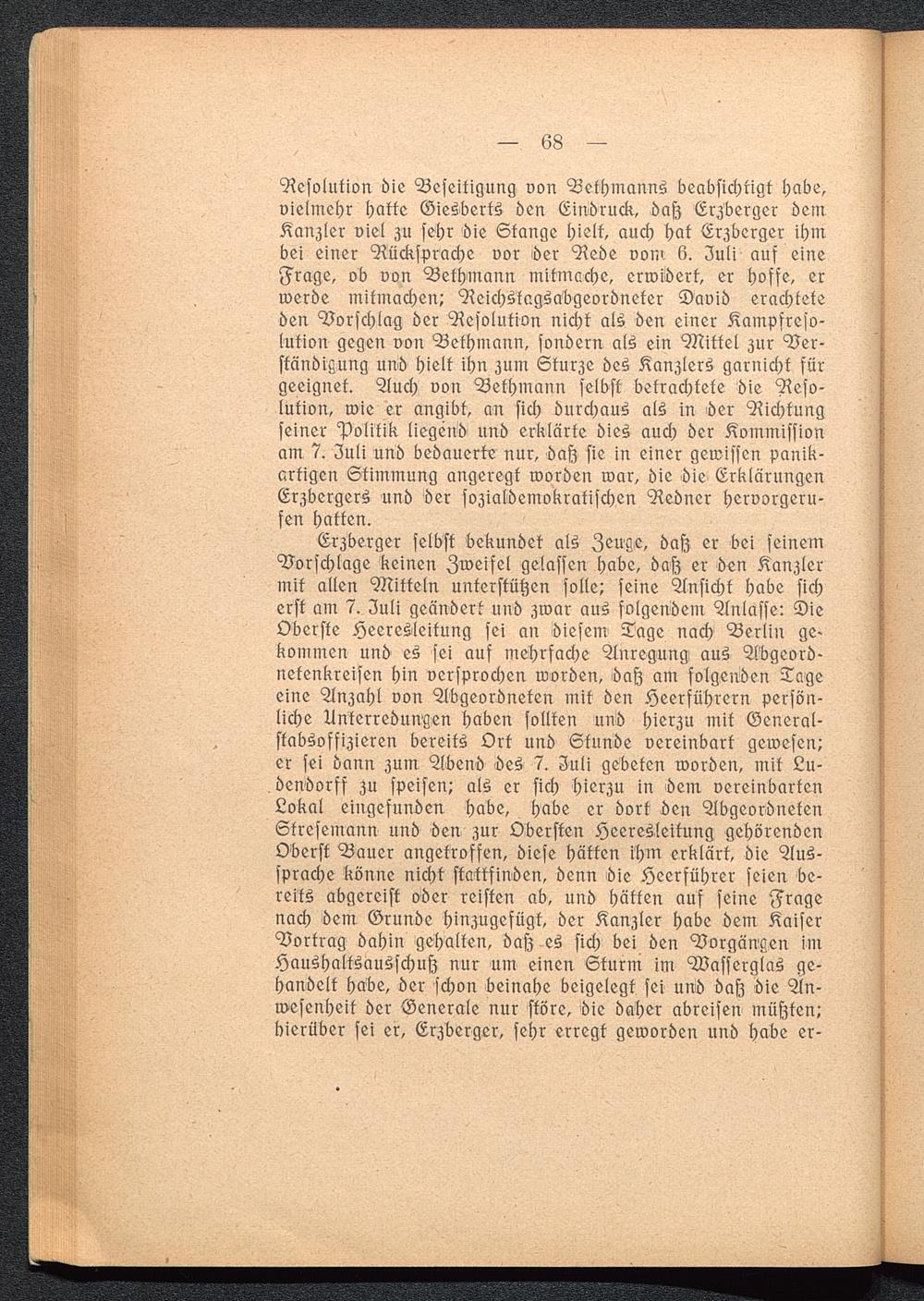 Erzberger selbst bekundet als Zeuge, dafz er bei seinemBorschlage keinen Zweifel gelassen habe, dafz er den Kanzlermit allen Mitteln unterstützen solle! seine Ansicht habe sicherst am 7. Zuli geändert und zwar aus folgendem Anlasse: DieOberste Heeresleitung sei an diesem Tage nach Berlin ge>kommen und es sei auf mehrfache Anregung aus Abgeord-netenkreisen hin versprochen worden, baß am folgenden Tageeine Anzahl von Abgeordneten mit den Heerführern versön-liche Unterredungen haben sollten und hierzu mit General-stabsoffizieren bereits Ort und Stunde vereinbart gewesen!er sei dann zum Abend des 7. Juli gebeten worden, mit Lu-. dendorff zu speisen! als er sich hierzu in dem vereinbartenLokal eingefunden habe, habe er dort ben AbgeordnetenStresemann und den zur Obersien Heeresleitung gehörendenOberst Bauer angetroffen, diese hätten ihm erklärt, die Aus-sprache könne nicht stattfinden, denn bie Heerführer seien be-reits abgereist oder reisten ab, und hätten auf seine Fragenach dem Grunde hinzugefügt, der Kanzler habe dem KaiserBortrag dahin gehalten, dafz es sich bei den Borgängen imHaushaltsausschuß nur um einen Sturm im Wasserglas ge-handelt habe, der schon beinahe beigelegt sei und daß die An-Wesenheit der Generale nur störe, die daher abreisen müßten,'hierüber sei er, Erzberger, sehr erregt geworden und habe er-