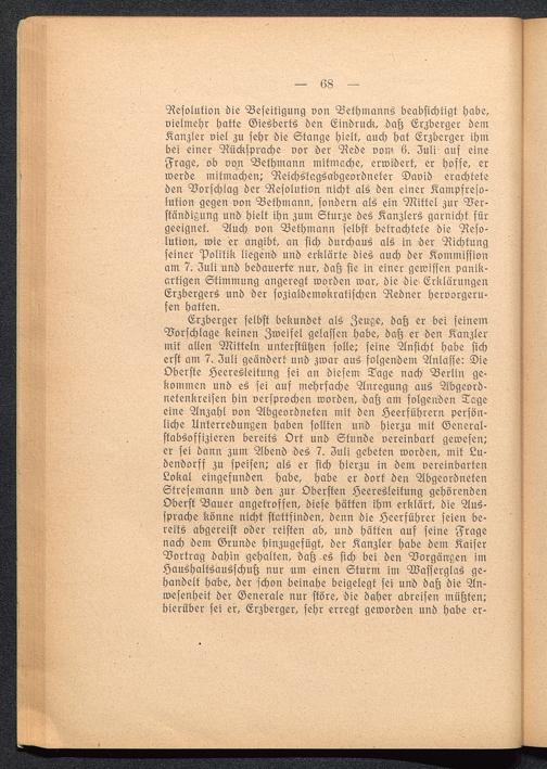 Resolution die Beseitigung von Bethmanns beabsichtigt habe,vielmehr hatte Giesberts den Eindruck, dafz Erzberger demKanzler viel zu sehr die Stange hielt, auch hat Erzberger ihmbei einer Rücksprache vor ber Rede vom 6. Zuli auf eineFrage, ob von Bethmann mitmache, erwidert, er hoffe, erwerde mitmachen! Reichstagsabgeordneter David erachteteden Borschlag der Resolution nicht als den einer Kampfreso-lution gegen von Bethmann, sondern als ein Mittel zur Ver-ständigung und hielt ihn zum Sturze des Kanzlers garnicht fürgeeignet. Auch von Bethmann selbst betrachtete die Reso-lution, wie er angibt, an sich durchaus als in >der Richtungseiner Politik liegend und erklärte dies auch der Kommissionam 7. Zuli und bedauerte nur, dafz sie in einer gewissen panik-artigen Stimmung angeregt worden war, die die ErklärungenErzbergers und der sozialdemokratischen Redner hervorgeru-fen hatten.