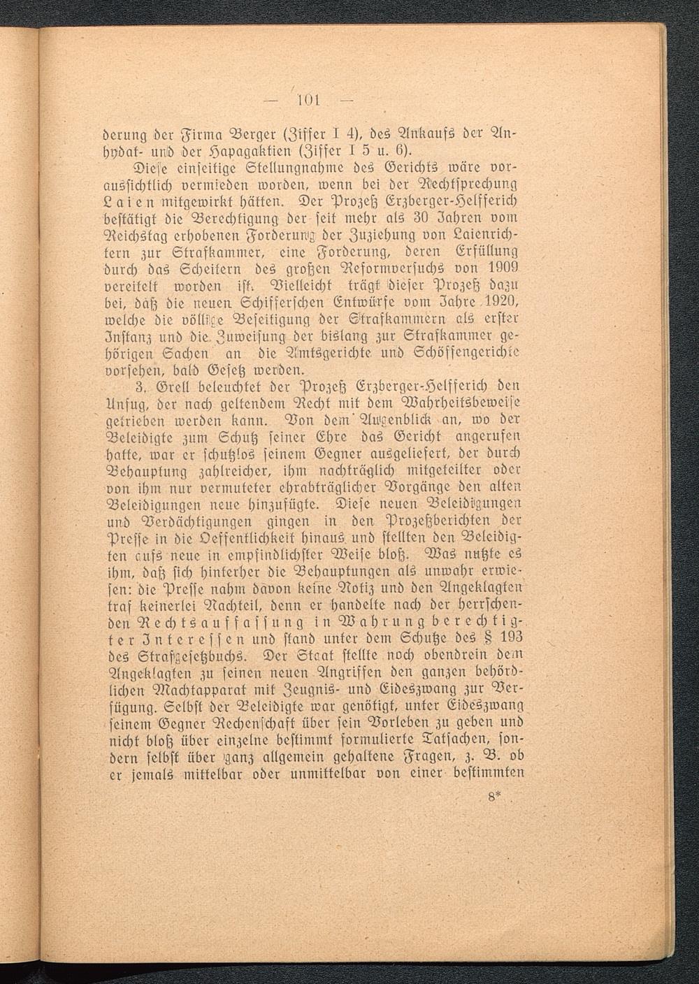 Diese einseitige Stellungnahme des Gerichts wäre vor-aussichtlich vermieden worden, wenn bei der RechtsprechungLaien mitgewirkt hätten. Der Prozeß Erzberger-Helfferichbestätigt die Berechtigung der seit mehr als 30 Jahren vomReichstag erhobenen Forderung der Zuziehung von Laienrich-tern zur Strafkammer, eine Forderung, deren Erfüllungdurch das Scheitern des großen Reformversuchs von 1999vereitelt worden ist. Vielleicht trägt dieser Prozeß dazubei, daß die neuen Schifferschen Entwürfe vom Zahre 1929,welche die völlige Beseitigung der Strafkammern als ersterZnstanz und die Zuweisung der bislang zur Strafkammer ge-hörigen Sachen an die Amtsgerichte und Schöffengerichtevorsehen, bald Gesetz werden.