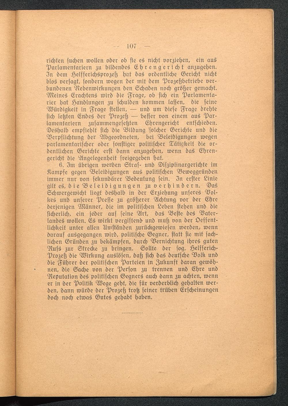 richten suchen wollen oder ob sie es nicht vorziehen, ein ausParlamentariern zu bildendes Ehrengericht anzugehen.In dem Helfferichsprozeß hat das ordentliche Gericht nichtblos versagt, sondern wegen der mit dem Prozeßbetriebe ver-bundenen Nebenwirkungen den Schaden noch größer gemacht.Meines Erachtens wird die Frage, ob sich ein Parlamenta-rier hat Handlungen zu schulden kommen lassen, die seineWürdigkeit in Frage stellen, — und um diese Frage drehtesich letzten Endes der Prozeß — besser von einem aus Par-lamentariern zusammengesetzten Ehrengericht entschieden.Deshalb empfiehlt sich die Bildung solcher Gerichte und dieVerpflichtung der Abgeordneten, bei Beleidigungen wegenparlamentarischer oder sonstiger politischer Tätigkeit die or-dentlichen Gerichte erst dann anzugehen, wenn das Ehren-gericht die Angelegenheit freigegeben hat.