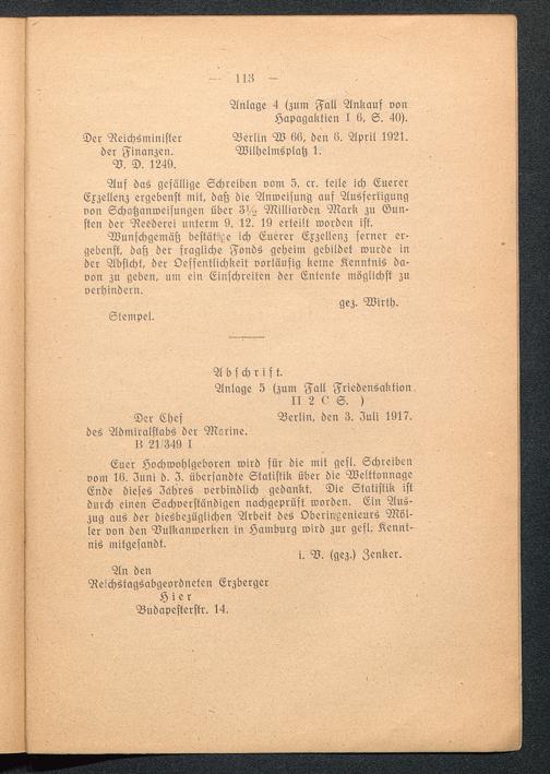 Wunschgemäß bestatte ich Euerer Exzellenz serner er-gebenst, daß der fragliche Fonds geheim gebildet wurde inder Absicht, der Öffentlichkeit vorläufig keine Kenntnis da-von zu geben, um ein Einschreiten der Entente möglichst zuverhindern.