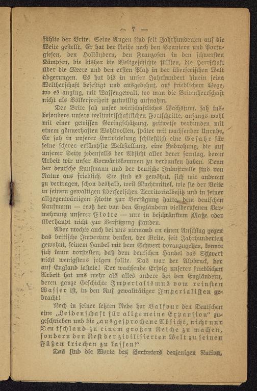 Der Brite sah unser wirtschaftliches Wachstum, sah ins-besondere unsere weltwirtschaftlichen Fortschritte, anfangs wohlmit einer gewissen Geringschätzung, zeitweise verbunden miteinem gönnerhaften Wohlwollen, später mit wachsender Unruhe«Er sah in unserer Entwickelung schließlich eine Gefahr fürseine schwer erkämpfte Weltstellung, eine Bedrohung, die aufunserer Seite jedenfalls der Absicht aller derer fernlag, derenArbeit wir unser Vorwärtskommen zu verdanken haben. Dennder deutsche Kaufmann und der deutsche Industrielle sind vonNatur aus friedlich. Sie sind es gewöhnt, sich mit anderenzu vertragen, schon deshalb, weil Machtmittel, wie sie der Britein seinem gewaltigen überseeischen Derritorialbesitz und in seinerallgegenwärtigen Flotte zur Verfügung hatte^.^em deutschen Kaufmann — trotz der von den Engläi^ern vielberufenen Ver-wehrung unserer -Flotte — nur in beschränktem Maßie oderüberhaupt nicht zur Verfügung standen.