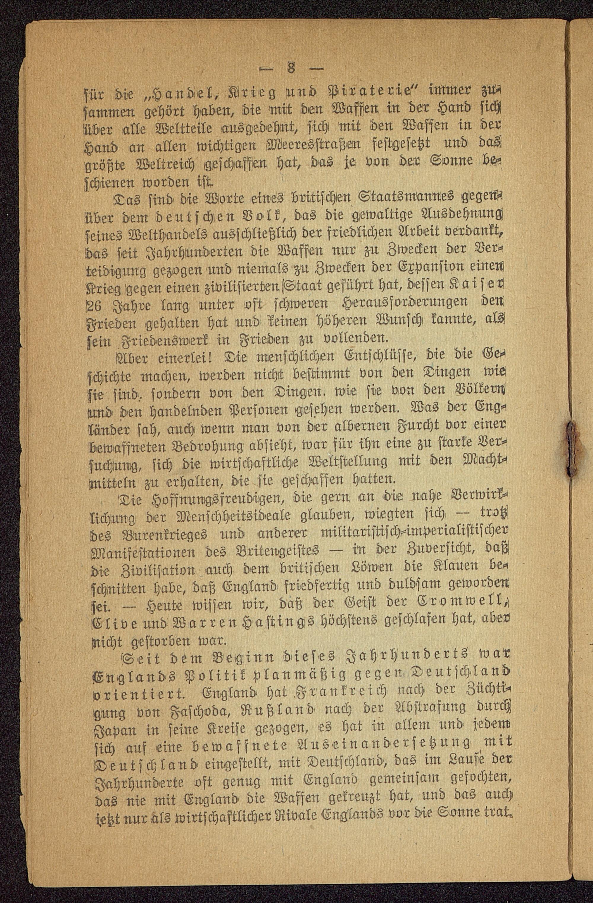 Seit dem Beginn dieses Jahrhunderts wa«Englands Politik planmäßig gegen Deutschland orientiert. England hat Frankreich nach der Züchti-gung von Faschoda, Rußland nach der Abstrafung durchJapan in seine Kreise gezogen, es hat in allem und jedemsich auf eine bewaffnete Auseinandersetzung, mitDeutschland eingestellt, mit Deutschland , das im Laufe derJahrhunderte oft genug mit England gemeinsam gefochten,das nie mit England die Waffen gekreuzt hat, und das auchjetzt nur als wirtschaftlicher Rivale Englands vor d-ie Sonne trat.