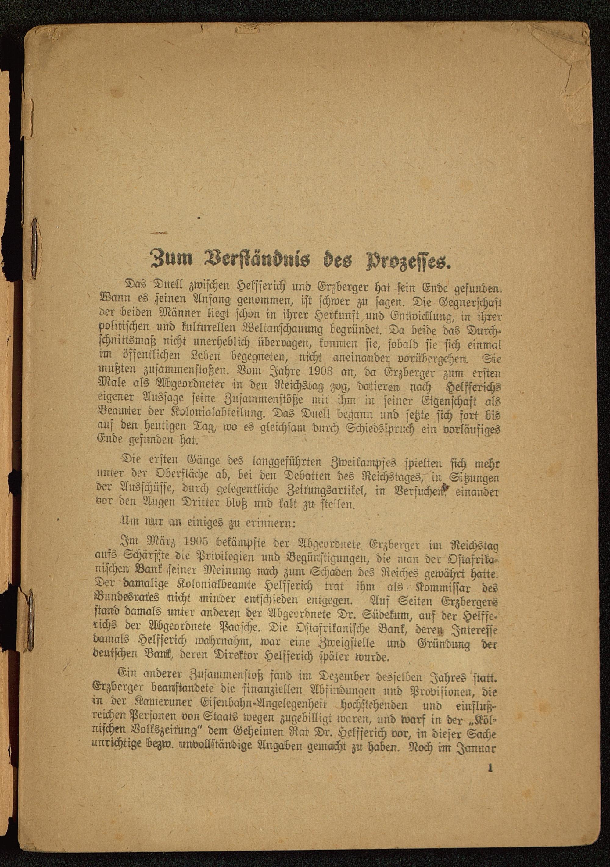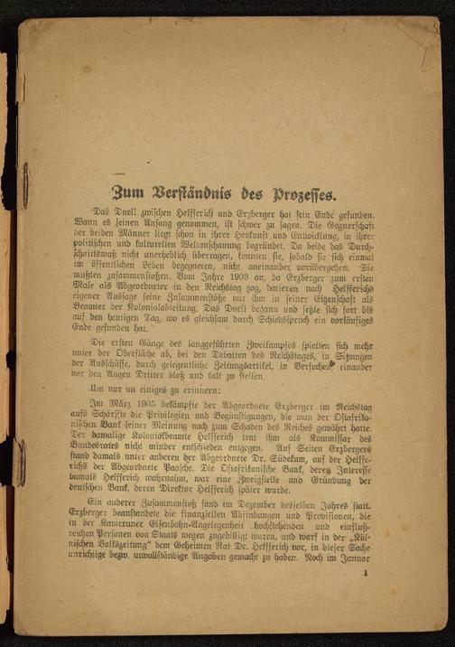 Das Duell zwischen Helsferich und Erzberger hat sein Ende gefunden.Wann es seinen Anfang genommen, ist schwer zu sagen. Die Gegnerschaftder beiden Männer liegt schon in ihrer Herkunst und Entwicklung, in ihrerpolitischen und kulturellen Weltanschauung begründet. Da beide das Durch-schnittsmaß nicht unerheblich überragen, konnten sie, sobald sie sich einmalim öffentlichen Leben begegneten, nicht aneinander vorübergehen. Siemußten zusammenstoßen. Vom Jahre 1903 an, da Erzberger zum erstenMale als Abgeordneter in den Reichstag gag, datieren nach Helfferichseigener Aussage seine Zusammenstöße mir ihm in seiner Eigenschaft alsBeamter der Kolonialabteilung. Das Dnell begann und setzte sich fort bisauf den heuiigen Tag, wo es gleichsam durch Schiedsspruch ein vorläufigesEnde gefunden hat.