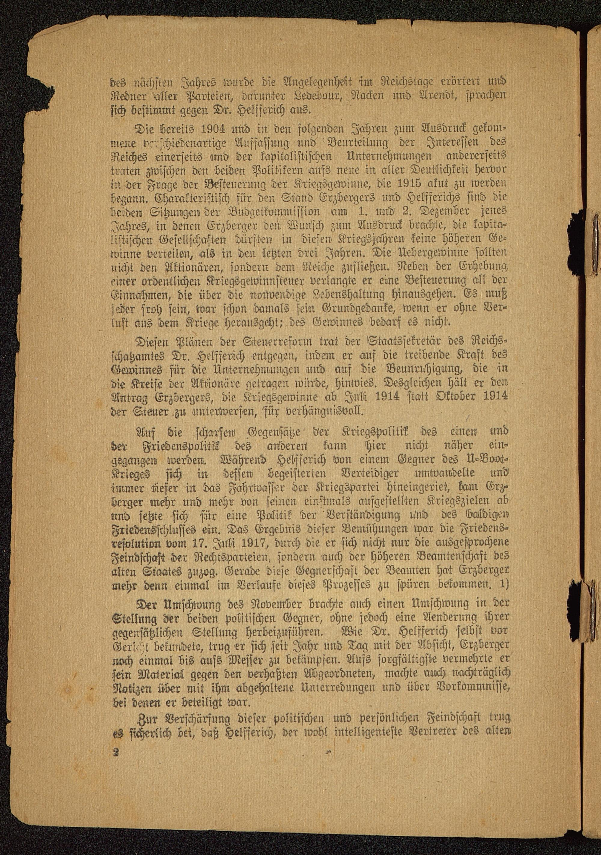 Auf die scharfen Gegensätze der Kriegspolitik des einen undder FriedenApolitiik des andren kann hier nicht näher ein-gegangen werden. Während Helsserich von einem Gegner des U°Boot-KriegeI sich in dessen begeisterten Verteidiger umwandelte undimmer riefer in das Fahrwasser der Kriegsparlei hineingeriet, kam Erz-bcrger mehr und mehr von seinen einstmals aufgestellten Kriegszielen abund setzte sich für eine Politik der 'Verständigung und des >ba>ldigenFriedensschlusses ein. Das Ergebnis dieser Bemühungen war die Friedens-resolution vom 17. Juli 1917, durch die er sich nicht nur die ausgesprocheneFeindschaft der Rechtsparteien, sondern auch der höheren Beamtenschaft desalten Staates zuzog. Gerade diese Gegnerschaft der Beamten hat Erzbergermehr denn einmal im Verlaufe dieses Prozesses zu spüren bekommen. 1)