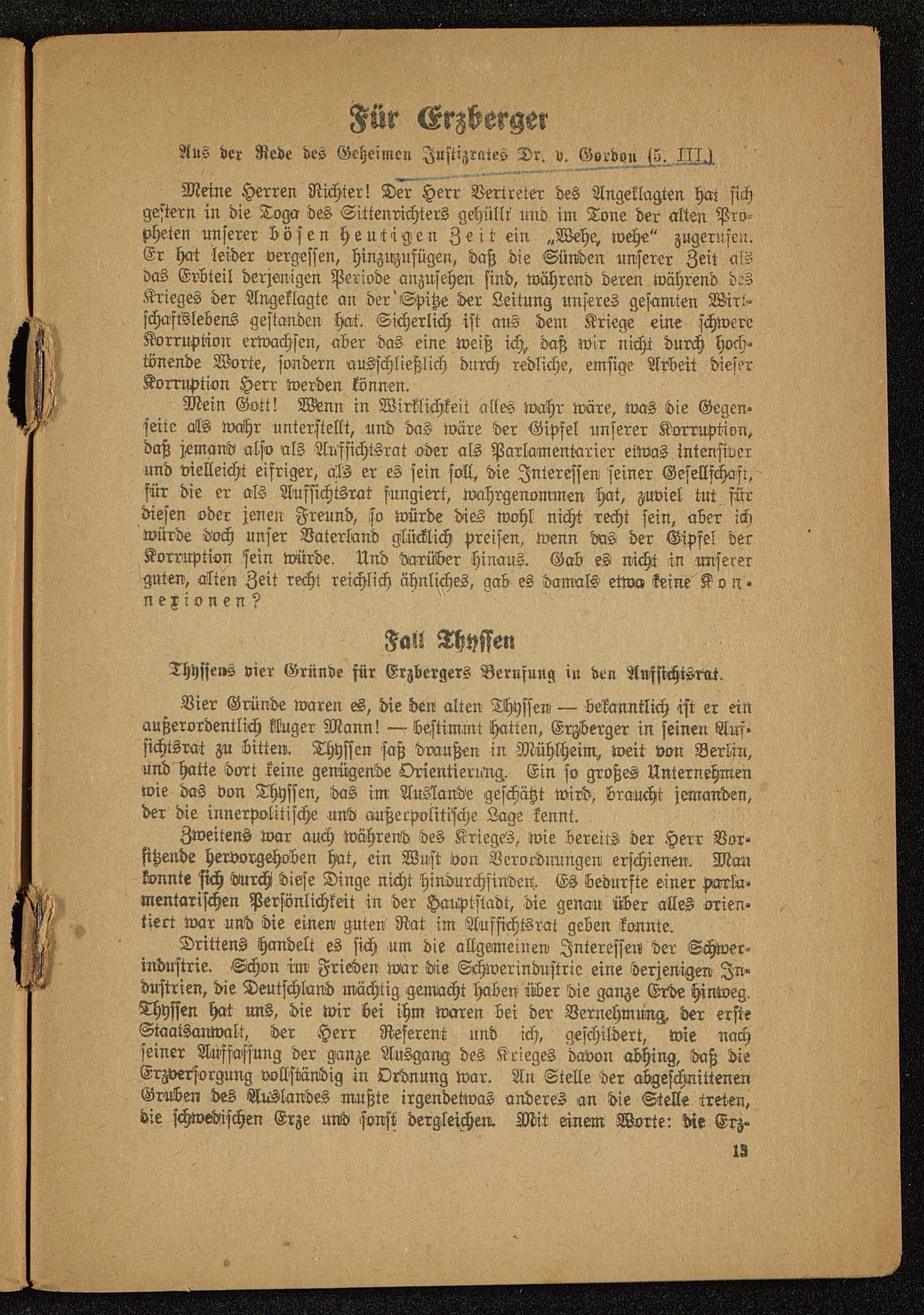 Vier Gründe waren es, die den alten Thyssen, — bekanntlich ist er einaußerordentlich kluger Mann! — bestimmt hatten, Erzberger in seinen Auf-sichtsrai zu bitten. Thyssen saß draußen in Mühlheim, weit von Berlin ,und hatte dort keine genügende Orientierung. Ein so großes Unternehmenwie das von Thyssen, das im Auslande geschätzt wird, braucht jemanden,der die innerpolitische und außerpolitische Lage kennt.