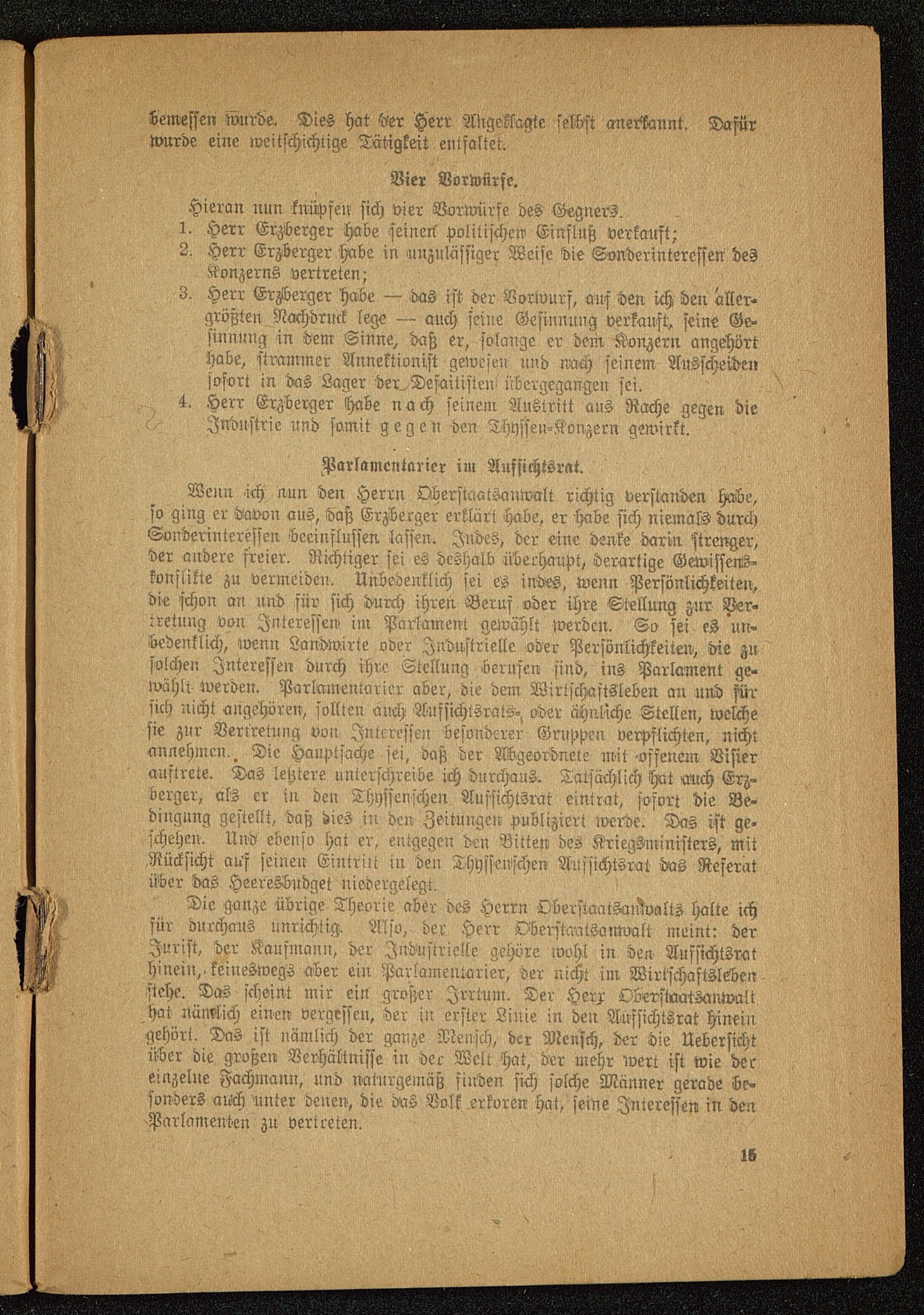 4. Herr Erzberger habe nach seinem Austritt aus Rache gegen diec> Industrie und somit gegen den Thyssen-Kanzern gewirkt.