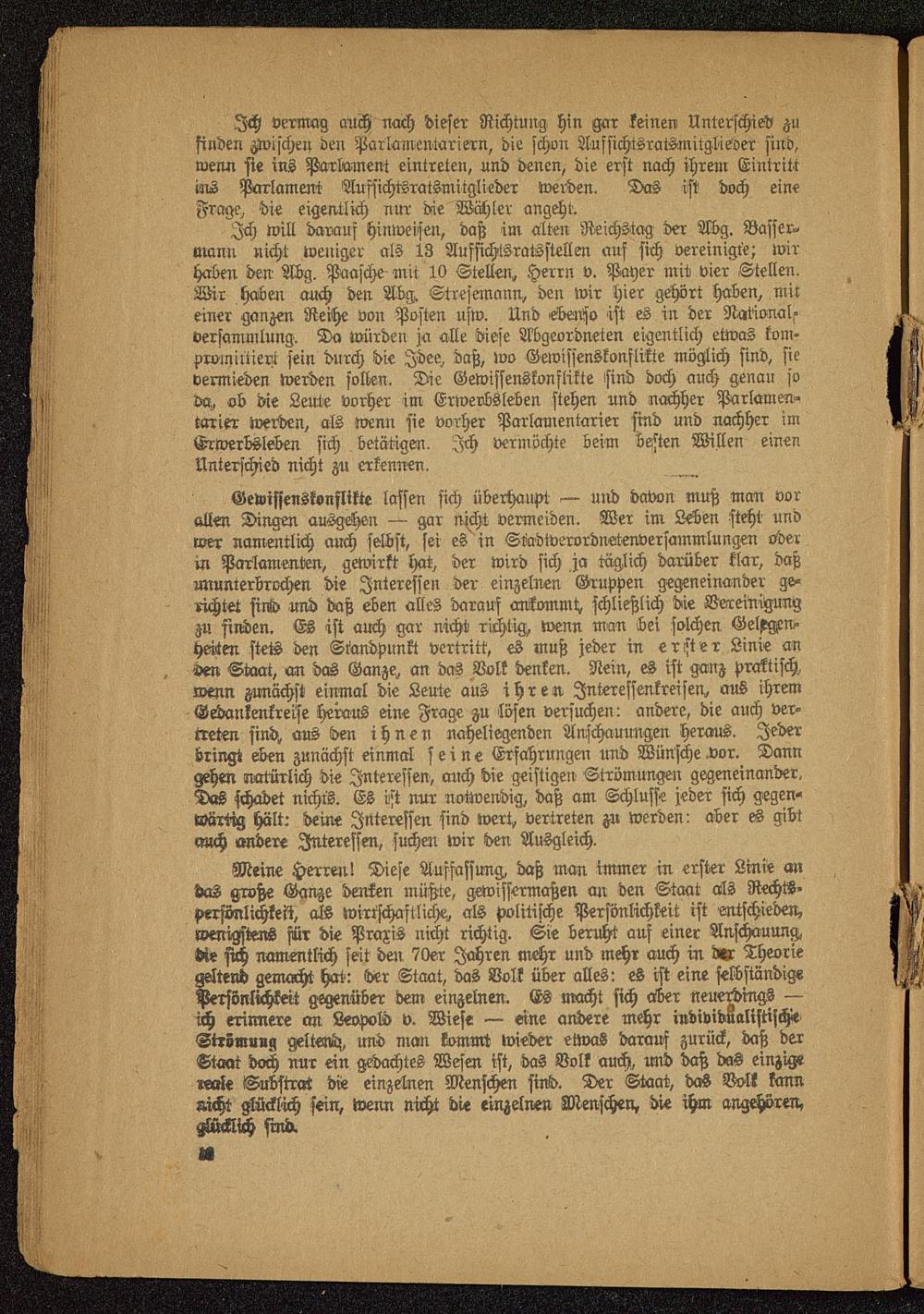 Meine Herren! Diese Auffassung, daß man immer in erster Linie andas große Ganze denken müßte, gewissermaßen an den Staat als Rechts-verfönlichkeir, als wirtschaftliche, als politische Persönlichkeit ist entschieden,wenigstens für die Praxis nicht richtig. Sie beruht auf einer Anschauung,die sich namentlich feit den 70er Jahren mehr und mehr auch in dr Theoriegeltend gemacht hat: der Staat, das Volk über alles: es ist eine selbständigePersönlichkeit gegenüber dem einzelnen. Es macht sich aber neuerdings —ich erinnere an Leopold v. Wies« — «ine andere mehr individualistisch!«Strömung geltenh, und man kommt wieder etwas darauf zurück, daß derStaat doch nur ein gedachtes Wesen ist, das Volk auch, und daß das einzigereale Substrat die einzelnen Menschen sind. Der Staat, das Volk kannmcht glücklich sein, wenn nicht die einzelnen Menschen, die ihm angehören,glücklich sind.