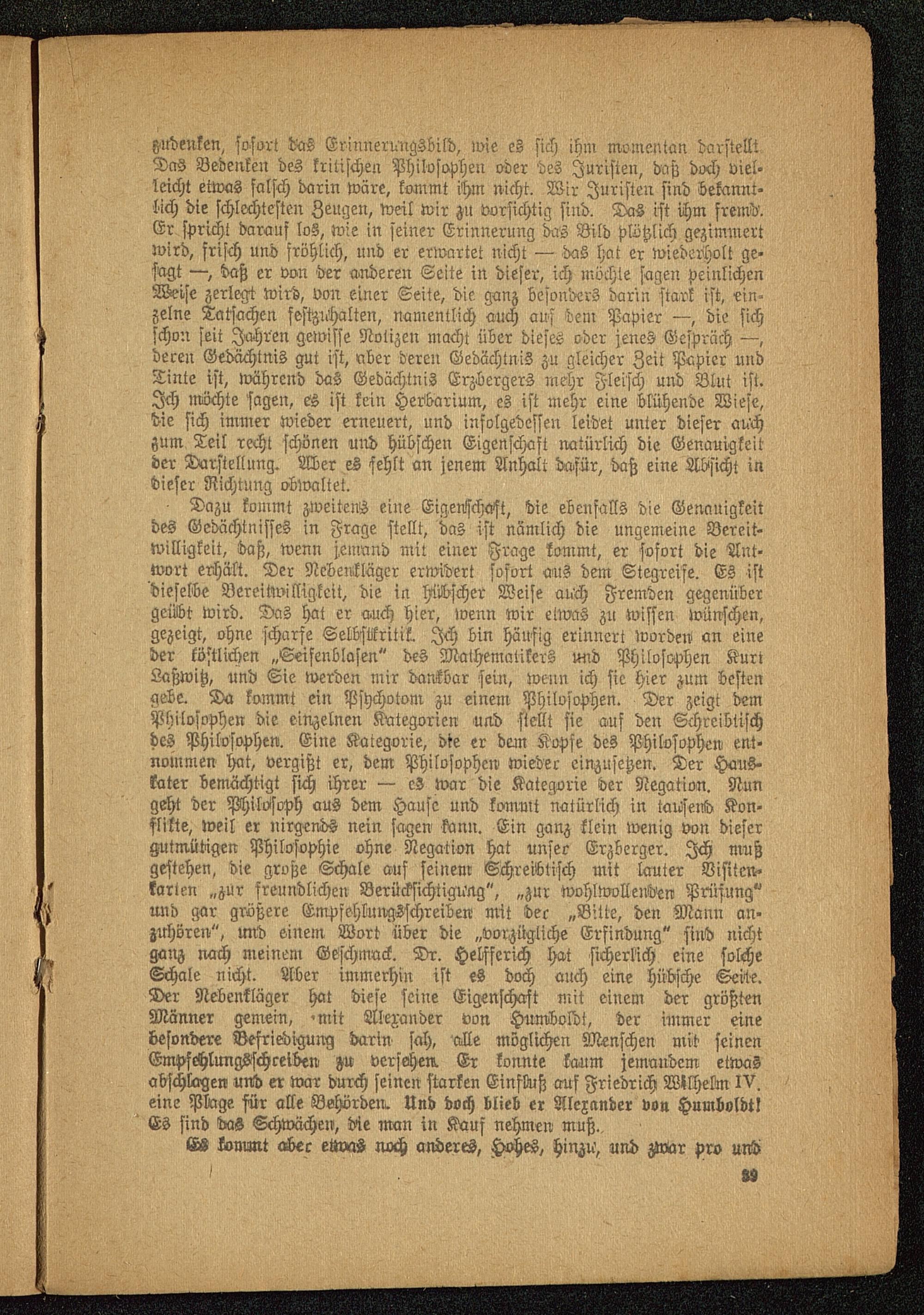 - Dazu kommt zweitens eine Eigenschaft, die ebenfalls die Genauigkeitdes Gedächtnisses in Frage stellt, das ist nämlich die ungemeine Bereit-willigkeit, !daß, wenn jemand mit einer Frage kommt, er sofort die Ant-wort erhält. Der NedeiMä'ger erwidert sofort aus dem Stegreife. Es istdieselbe Bereitwilligkeit, die in hiibscher Weise auch Fremden gegenübergeübt wird. Das hat er a.uch hier, wenn wir elwas zu wissen wünschen,gezeigt, ohne scharfe Selbstkritik. Ich bin häufig erinnert worden an eineder köstlichen „Seifenblasen" des Mathematikers und Philosophen KurtLaßwitz , und Sie werden mir dankbar sein, wenn ich sie hier zum bestengebe. Da kommt ein Psychotom zu einem Philosophen. Der zeigt demPhilosophen die einzelnen Kategorien und stellt sie auf den Schreibtischdes Philosophen. Eine Kategorie, dte er dein Kopse des Philosophen- ent-nommen hat, vergißt er, dem Philosophen- wieder einzusetzen. Der Ho-us-kater bemächtigt sich ihrer — cS war die Kategorie -der Negation. Nungeht der Philosoph aus dem Hause und kommt natürlich in tausend Kon-flikte, weil er nirgends nein sagen- kann. Ein ganz klein wenig von diesergutmütigen Philosophie ohne Negation hat unser Erzbcrger. Ich mußgestehen, die große Schale auf seinem Schreibtisch mit lauter Visiten-karten „zur freundlichen Berücksichtigung", „zur wohlwollenden Prüfung"und gar größere Empfehlungsschreiben mit der „Bitte, den Mann an-zuhören", und einem Wort über die „vorzügliche Erfindung" sind nichtganz noch meinem Geschmack. Dr. Helfferich hat sicherlich eine solcheSchale nicht. Aber immerhin ist es doch auch eine hübsche Sei-te.Der Nebenkläger hat diese seine Eigenschaft mit einem der größtenMänner gemein, 'Mit Alexander von Humboldt , der immer einebesondere Befriedigung darin sah, alle möglichen Menschen mit seinenEmpfchlungSschceiben Ku- verschen. Er konnte kaum jemandem etwasabschlagen und er war durch seinen starken Einfluß auf Friedrich Wilhelm IV. eine Plage für alle Behörden^ Und doch blieb er Alexander von Humboldt !Es sind das Schwächen, die man in Kauf nehmen muß..