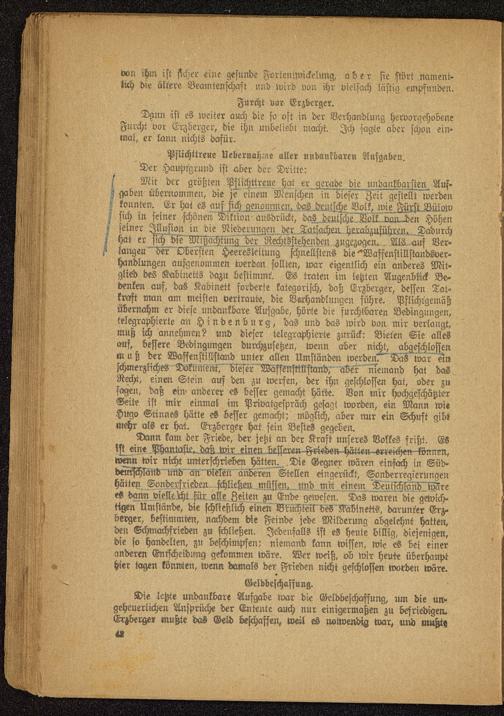Die letzte undankbare Aufgabe war die Geldbeschaffung, um die un-geheuerlichen Ansprüche der Entente auch nur einigermaßen zu befriedigen.Erzberger mußte das Geld beschaffen, weil es notwendig war, und mußt«