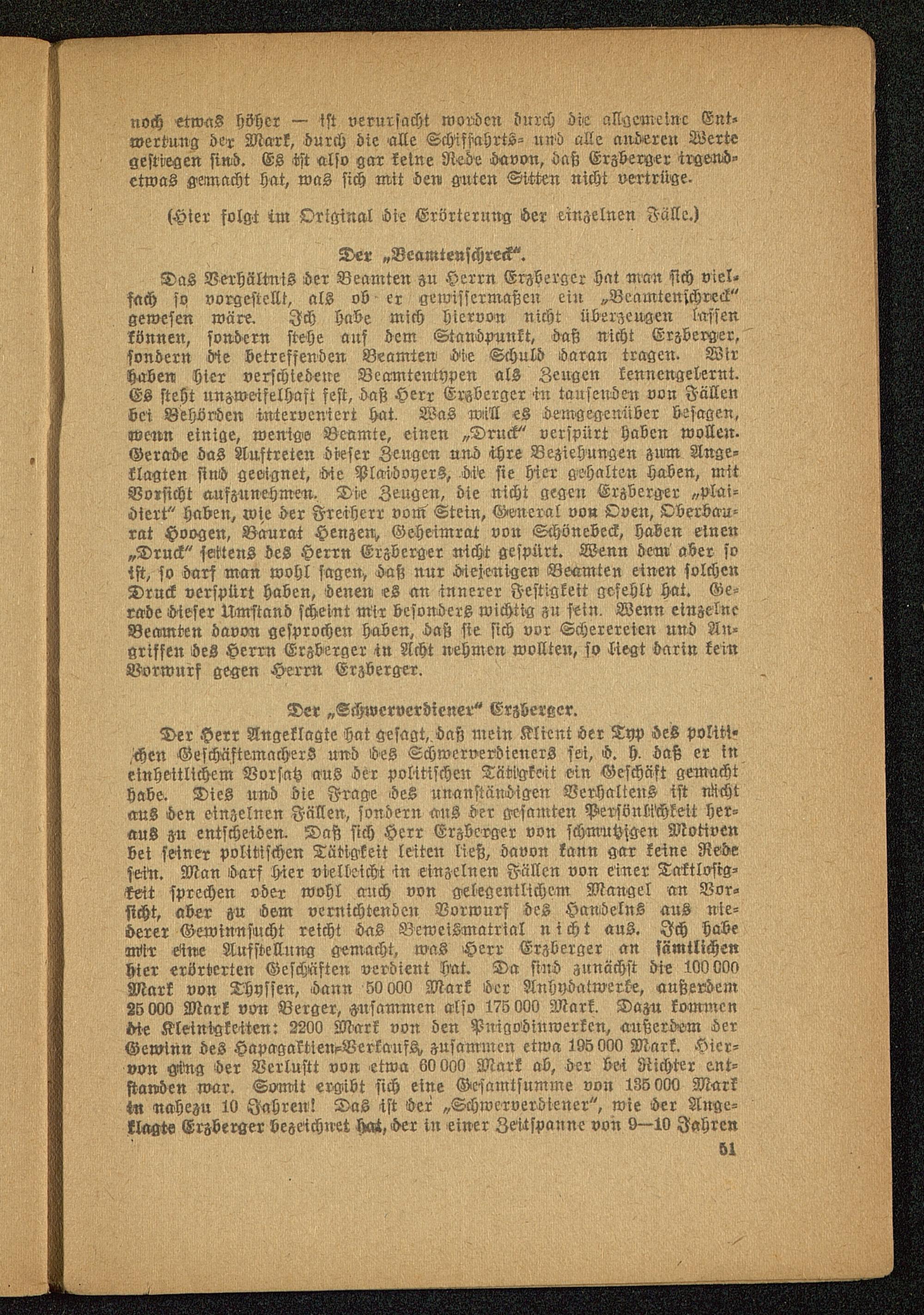 Der „Schwerverdiener" Erzbereer.Der Herr Angeklagte hat gesagt, Saß mein Klient der Typ des politi-schen Geschäftemachers und des Schwerverdieners sei, d. h, daß er ineinheitlichem Borsatz aus der politischen Tätigkeit ein Geschäft gemachthabe. Dies und die Frage des unanständigen Verhaltens ist Mchtaus den einzelnen Fällen, sondern ans der gesamten Persönlichkeit her-aus zu entscheiden. Daß sich Herr Erzberger von schmutzigen Motivenbet seiner politischen Tätigkeit leiten ließ, davon kann gar keine Redesein. Man darf Hier vielleicht in einzelnen Fällen von einer Taktlosig-keit sprechen oder wohl auch von gelegentlichem Mangel an Vor-sicht, aber zu dem vernichtenden Vorwurf des Handelns aus nie-derer Gewinnsucht reicht das Beweismatrial nicht aus. Ich habemir eine Aufstellung gemacht, was Herr Erzberger an sämtlichenhier erörterten Geschäften verdient hat. Da sind zunächst die IM 000Mark von THyssen, dann 60 000 Mark der Anhydatwerke, außerdemLlZvvo Mark von Berger, «zusammen also 173 000 Mark. Dazn kommendie Kleinigkeiten: 2200 Mark von den Pnigodinwerken, außerdem derGewinn des Hapagaktien-äVerkanfH, zusammen etwa 19S000 Mark. Hier-von ging der Verlustt von etwa 60 000 Mark ab, der bei Richter ent-standen war. Somit ergibt sich eine Gesamtsumme von 135 000 Markt« nahezu 10 Jahren! Das ist der „Schwerverdiener", wie der Ange-klagte Erzberger bezeichnet hat, der in einer Zeitspanne von 9—10 Jahren
