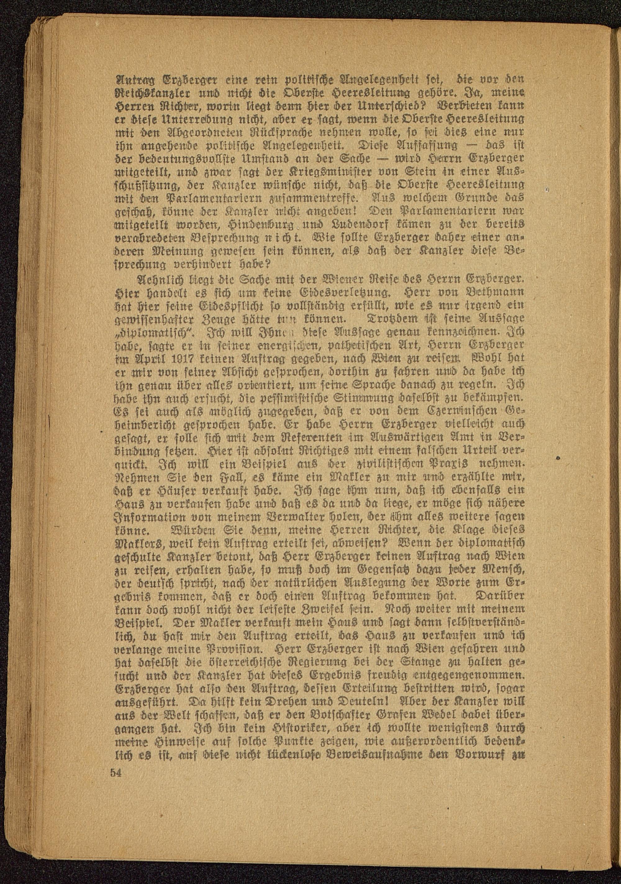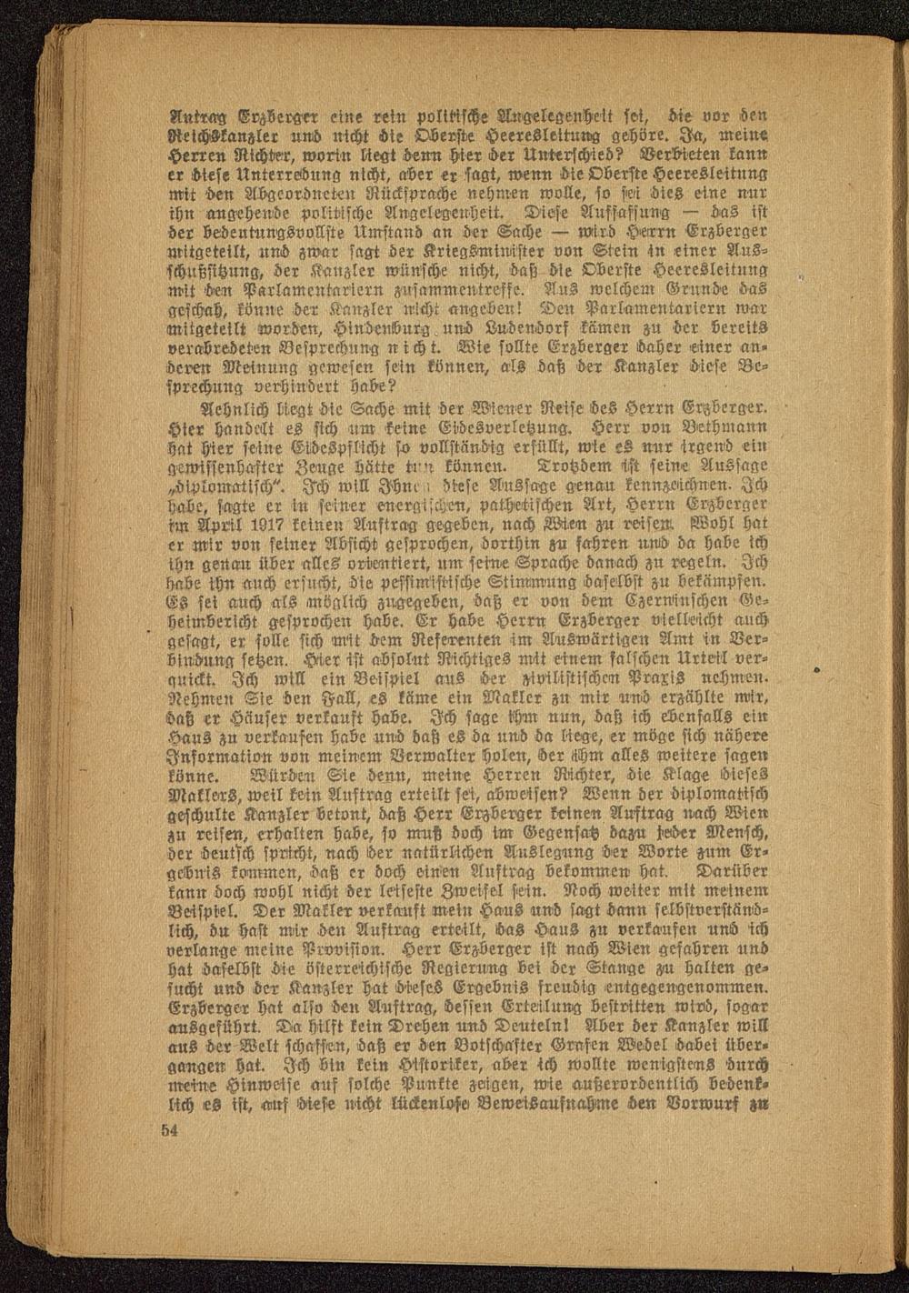 Aehnlich liegt die Sache mit der Wiener Reise deS Herrn Erßberger.Hier handelt es sich um -keine Eidesverlctzung. Herr von V-ethmannhat hier seltne Eiidespslicht so vollständig erfüllt, wie es nnr irgend eingewissenhafter Zeuge Hätte ti'r können. Trotzdem ist seine Aussage„diplomatisch". Ich will Ihm > diese Aussage genau kennzeichnen. Ichhabe, sagte er in seiner -energischen, pathetischen, Art, Herrn Erzbergerim April 1S17 keinen Auftrag gegeben, nach Wien zu reisen. Wohl hater mir von setner Absicht gesprochen, dorthin zu fahren und da habe ichihn genau über alles ori-emt-iert, nm seine Sprache danach zu regeln. Ichhabe ihn auch ersucht, die pessimistische Stimmung dase-lbst zu bekämpfen.Es sei auch als möglich zugegeben, daß er von dem Czerttinschen Ge-heimbericht gesprochen habe. Er habe Herrn Erzberger vielwicht auchgesagt, er solle sich -mit dem Referenten im Auswärtigen Amt in Ver-bindung setzen. Hier ist absolut Nichtiges mit einem falschen Urtvi-l ver-quickt. Ich will ein Beispiel aus der zivilistischcn Praxis nehmen.Nehmen Sie den Fall, es käme ein Makler zu mir und erzählte mir,daß er Häuser verkauft habe. Ich sage ihm nun, daß ich ebenfalls einHaus zu verkaufen habe und baß es da und da ttege, er möge sich nähereInformation von meinem Verwalter holen, der Gm alles weitere sagenkönne. Würden Sie denn, meine Herren Richter, die Klage diesesMaklers, weil kein Auftrag erteilt sei, abweisen? Wenn der diplomatischgeschulte Kanzler betont, daß Herr Erzberger keinen Auftrag nach Wien zu reisen, erhalten habe, so muß doch im Gegensatz dazu tvder Mensch,der deutsch spricht, nach der uatürl-ichen Auslegung der Worte zum Er-gebnis kommen, daß er doch einen Auftrag bekommen hat. Darüberkann doch wohl nicht der leiseste Zweifel sein. Noch weiter mit meinemBeispiel. Der Makler verkauft mein Haus und sagt dann selbstverständ-lich, du hast mir den Auftrag erteilt, das Haus zu verkaufen und ichverlange meine Provision. Herr Erzberger ist nach Wien gesahren undHat daselbst die österreichische Regierung bei der Stange zu halten ge-sucht und der Kanzler hat dbeseS Ergebnis freudig entgegengenommen.Erzberger hat also den Äustrag, dessen Erteilung bestvitten wird, sogarausgeführt. Da hilft kein Drehen und Deuteln! Aber der Kanzler willaus der Welt schaffen, daß er den Botschafter Grafen Wedel dabei Über-gängen hat. Ich bin kein Historiker, aber ich wollte wenigstens durchmeine Hinweise auf solche Punkte zeigen, wie außerordentlich bedenk-lich es ist, auf diese nicht lückenlose! Beweisaufnahme den Vorwarf ztt