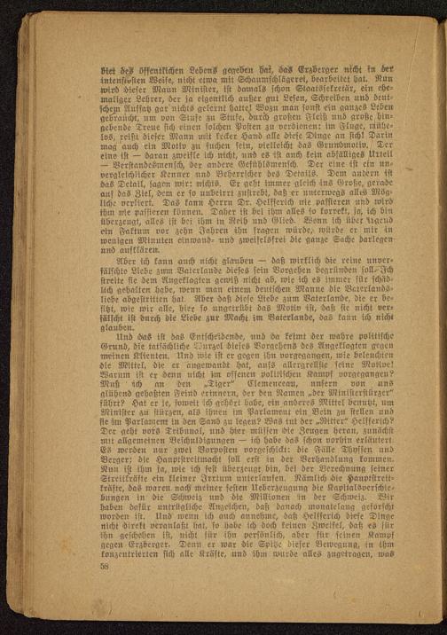 Stet SeP Sffentkichen LevemS gegeVen ha?, SaS Erzberger nicht in He<intensivsten Weise, nicht etwa mit Schaumschlägerei, bearbeitet hat. NunWird dieser Mann Minister, ist damals schon Staatssekretär, sin ehe-maliger Lehrer, der ja eigentlich außer gut Lesen, Schreiben und deut-schem Aufsatz gar nichts gelernt hatte.! Wozn man sonst ein ganzes Lebengebraucht, um von Stufe z>u Stufe, durch großen Fleiß und große hin-gebende Treue sich einen solchen Posten zu verdienen: im Fluge, mühe-los, reißt dieser Mann mit kecker Hand alle Hiesc Dinge an sich! Darinmag auch ein Motiv zu suchen sein, vielleicht das Grunidmotiv. Dereine ist — Haran zweifle ich nicht, und es ist auch kein abfälliges Urteil— Verstandesmensch, Her andere Gefühlsmensch, Der eine ist ein un-vergleichlicher Kenner und Beherrscher des Details. Dem andern istHas Detail, sagen wir: nichts. Er geht immer gleich ins Große,! geradeauf das Ziel, Hem er so unbeirrt zustrebt, daß er unterwegs alltS Mög-liche verliert. Das kann Herrn Dr. Helfferich nie passieren und wir>dihm nie passieren können. Daher ist bei ihm alles so korrekt, ja^ ich binüberzeugt, alles ist bei ihm in Neih und Glied. Wenn ich über Irgendein Faktum vor zehn Jahren ihn fragen würde,'würde er mir inwenigen Minuten einwand- und zweifelsfrei die ganze Sache darlegen-und aufklären.