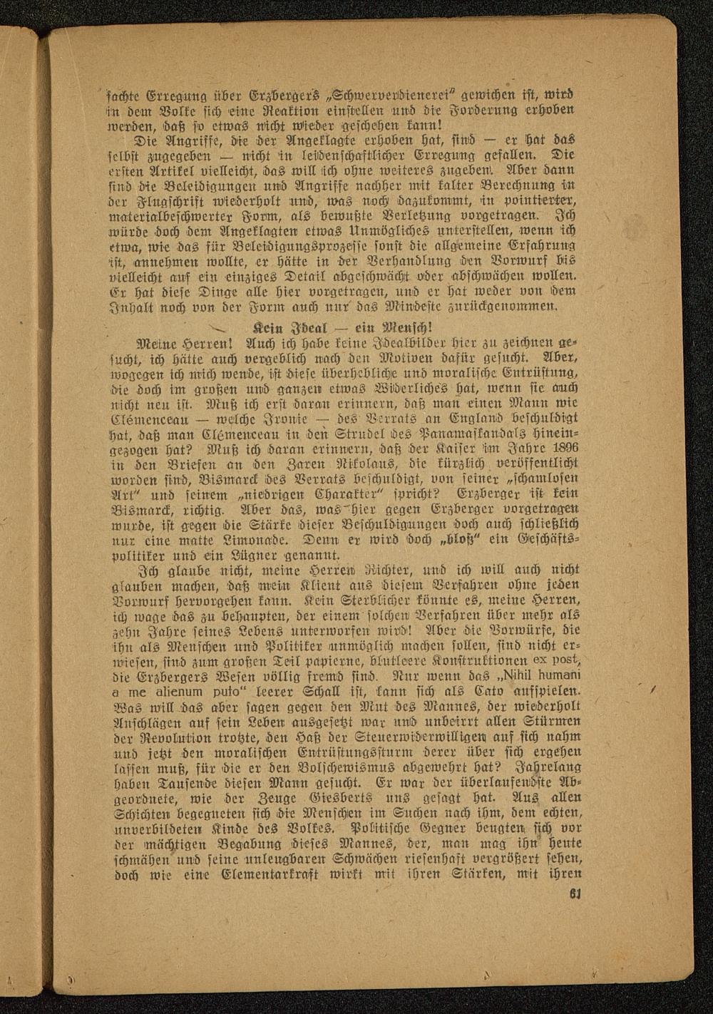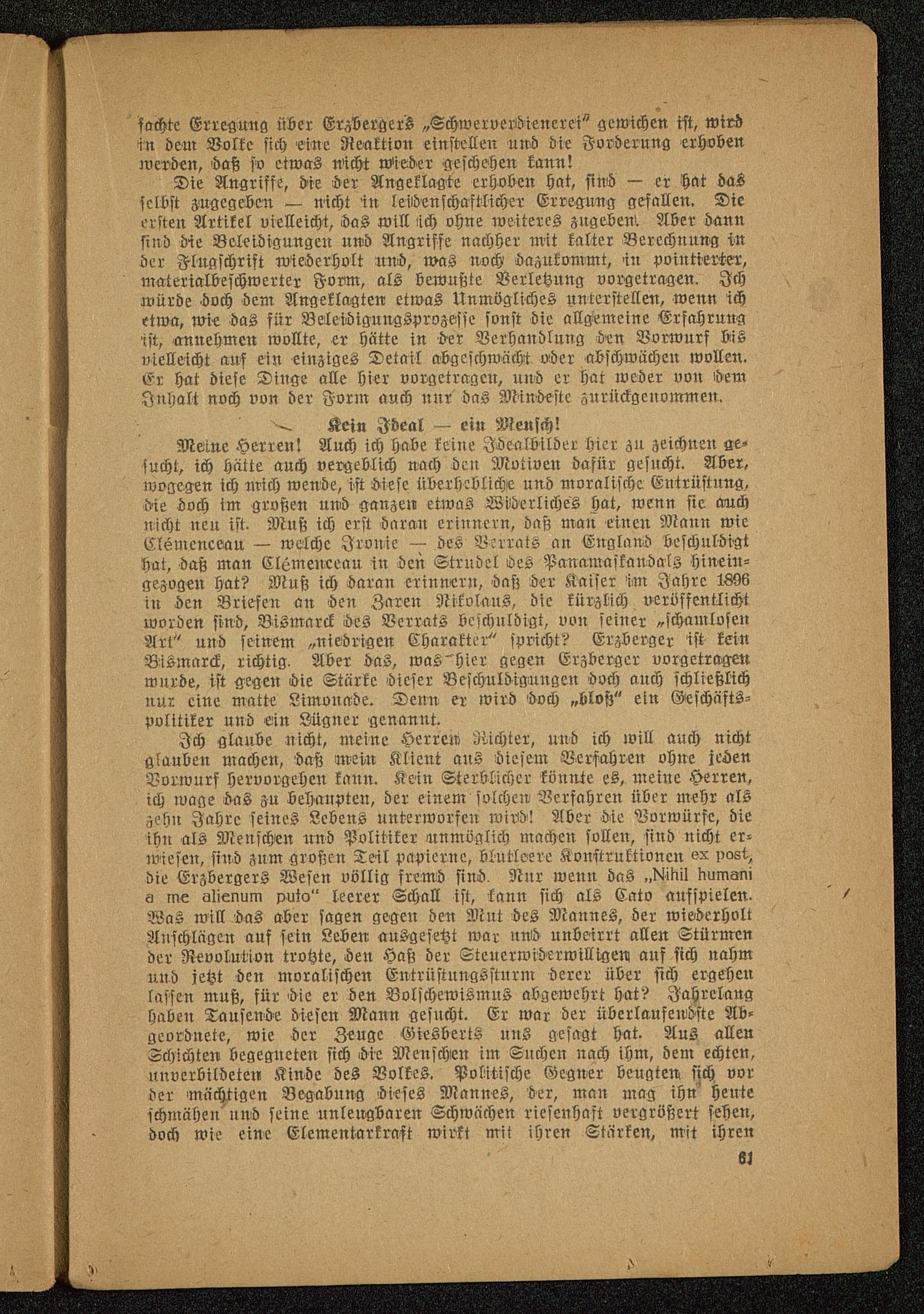 Ich glaube nicht, meine Herren Richter, und ich will auch nichtglauben machen, daß mein Klient ans diesem Verfahren ohne jedenVorwurf hervorgehen kann. Kein Sterblicher könnte es, meine Herren,ich wage das zu behaupten, der einem solchen Verfahren über mehr alszehn Jahre seines Lebens unterworfen wird! Aber die Borwürfe, dieihn als Menschen nnd Politiker unmöglich machen sollen, sind nicht er-wiesen, sind zum großen Teil papicrne, blutleere Konstruktionen sx post,die Erzbergers Wesen völlig fremd sind. Nur wenn das ,MmI numsnis me älienum puto" leerer Schall ist, kann sich als Cato aufspielen. ' /