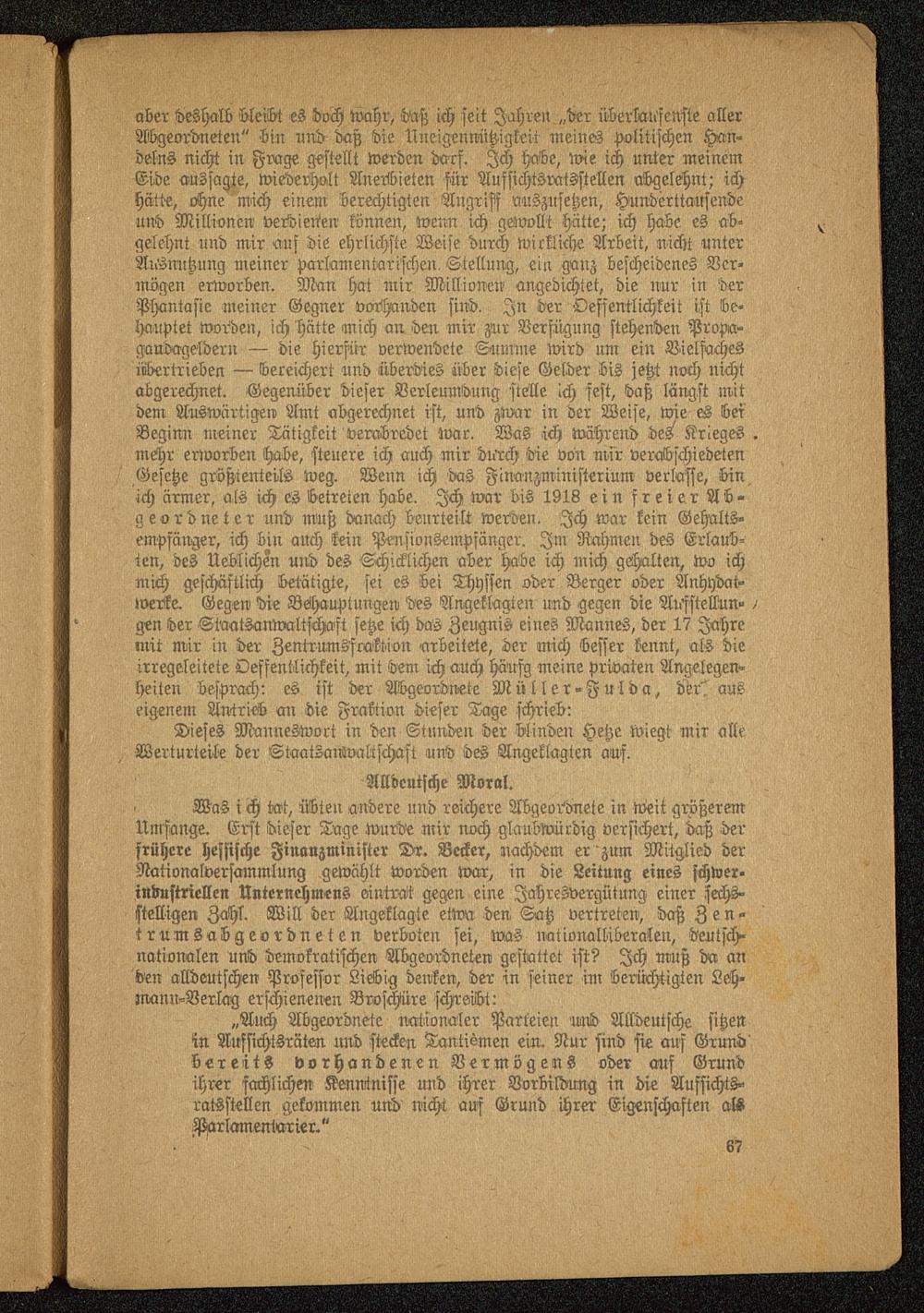 Was i ch tat, übten andere und reichere Abgeordnete in weit größeremUmfange. Erst dieser Tage wurde mir noch glaubwürdig versichert, daß derfrühere hessische Finanzminister Dr. Becker, nachdem er zum Mitglied derNationalversammlung gewählt worden war, in die Leitung eines schwer-industriellen Unternehmens eintrat gegen eine Jahresvergütung einer sechs-stelligen Zahl. Will der Angeklagte etwa den Satz vertreten, daß Zen-trumsabgeordneten verboten sei, was nationalliberalen, deutsch -nationalen und demokratischen Abgeordneten gestattet ist? Ich muß da anden alldeutschen Professor Liebig denken, der in seiner im berüchtigten Leh-mann-Verlag erschienenen Broschüre schreibt: