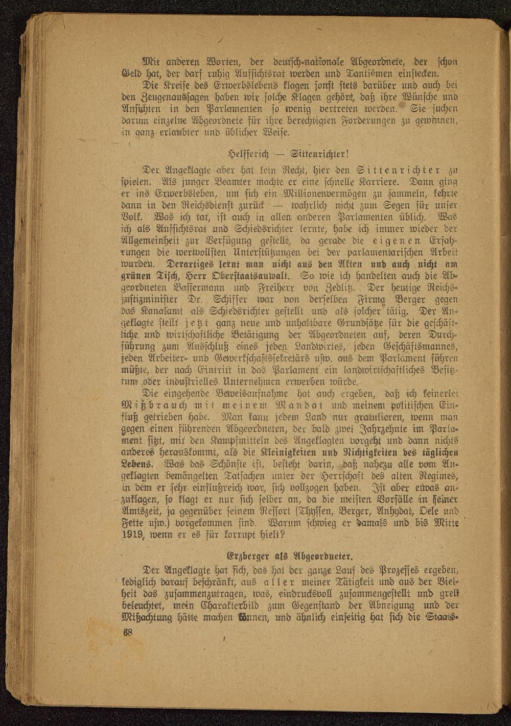 Die eingehende Beweisaufnahme hat auch ergeben, daß ich keinerleiMißbrauch mit meinem Mandat und meinem politischen Ein-fluß getrieben habe. Man kann jedem Land nur gratulieren, wenn mangegen einen führenden Abgeordneten, der bald zwei Jahrzehnte im Parla-ment sitzt, mit den Kampfmitteln des Angeklagten vorgeht und dann nichtsanderes herauskommt, als die Kleinigkeiten und Nichtigkeiten des täglichenLebens. Was das Schönste ist, besteht darin, baß nahezu alle vom An-geklagten bemängelten Tatsachen unter der Herrschaft des alten Regimes,in dem er sehr einflußreich war, sich vollzogen haben. Ist aber etwas an-zuklagen, so klagt er nur sich selber an, da die meisten Vorfälle in iseiinerAmtszeit, ja gegenüber seinem Ressort sThyssen, Berger, Anhydat, Oele undFette usw.) vorgekommen sind. Warum schwieg er damals und bis Mitte1819, wenn er es für korrupt hielt?