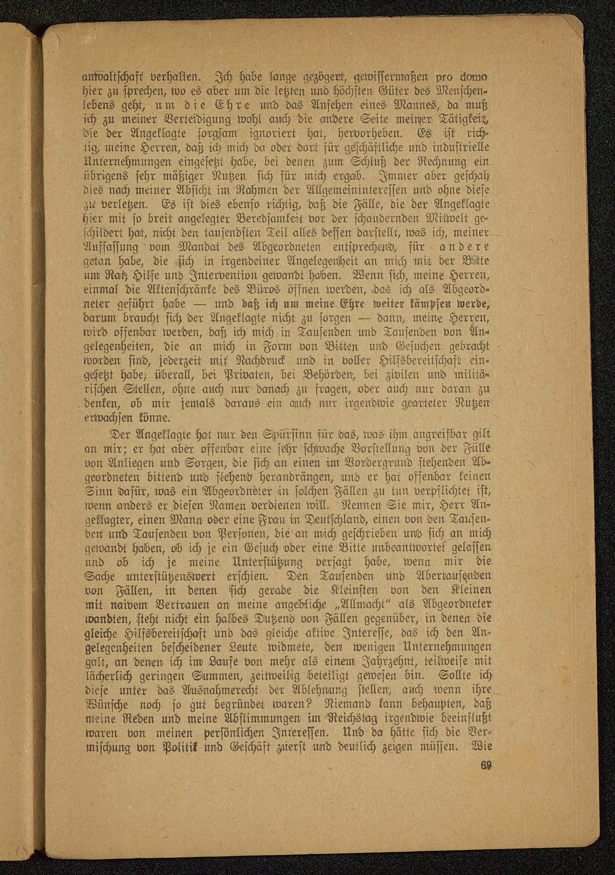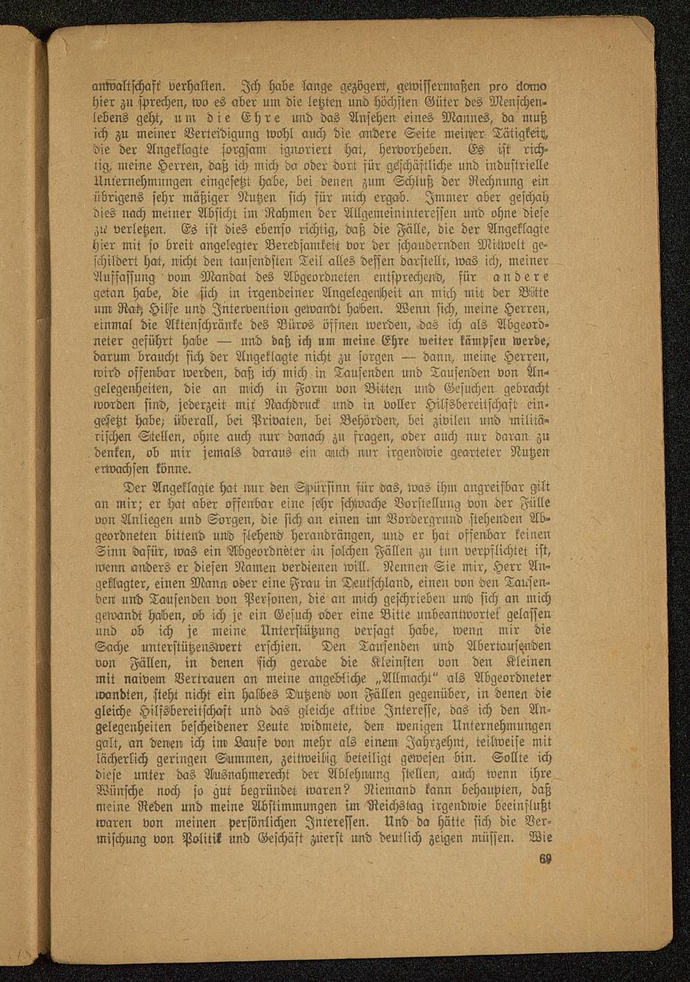 Der Angeklagte hat nur den Spürsinn für das, toas ihm angreifbar giltan mir; er hat aber offenbar eine sehr schwache Vorstellung von der Füllevon Anliegen und Sorgen, die sich an einen im Vordergrund stehenden Ab-geordneten bittend und flehend herandrängen, mid er hat offenbar keinenSinn dafür, was ein Abgeordneter in solchen Fällen zu tun verpflichtet ist,wenn anders er diesen Namen verdienen will. Nennen Sie mir, Herr An-geklagter, einen Mann oder eine Frau in Deutschland , einen von den Tausen-den und Tausenden von Personen, die an mich geschrieben und sich an michgewandt haben, ob ich je ein Gesuch oder eine Bitte unbeantwortet gelassenund ob ich je meine Unterstützung versagt habe, wenn mir dieSache unterstützenswert erschien. Den Tausenden und Abertausendenvon Fällen, in denen sich gerade die Kleinsten von den Kleinenmit naivem Vertrauen an meine angebliche „Allmacht" als Abgeordneterwandten, steht nicht ein halbes Dutzend von Fällen gegenüber, in denen diegleiche Hilfsbereitschaft und das gleiche aktive Interesse, das ich den An-gelegenheiten bescheidener Leute widmete, den wenigen Unternehmungengalt, an denen ich im Laufe von mehr als einem Jahrzehnt, teilweise mitlächerlich geringen Summen, zeitweilig beteiligt gewesen bin. Sollte ichdiese unter das Ausnahmerecht der Ablehnung stellen, auch wenn ihreWünsche noch so gut begründet waren? Niemand kann behaupten, daßmeine Reden und meine Abstimmungen im Reichstag irgendwie beeinflußtwaren von meinen persönlichen Interessen. Und da hätte sich die Ver-mischung von Politik und Geschäft zuerst und deutlich zeigen müssen. Wie