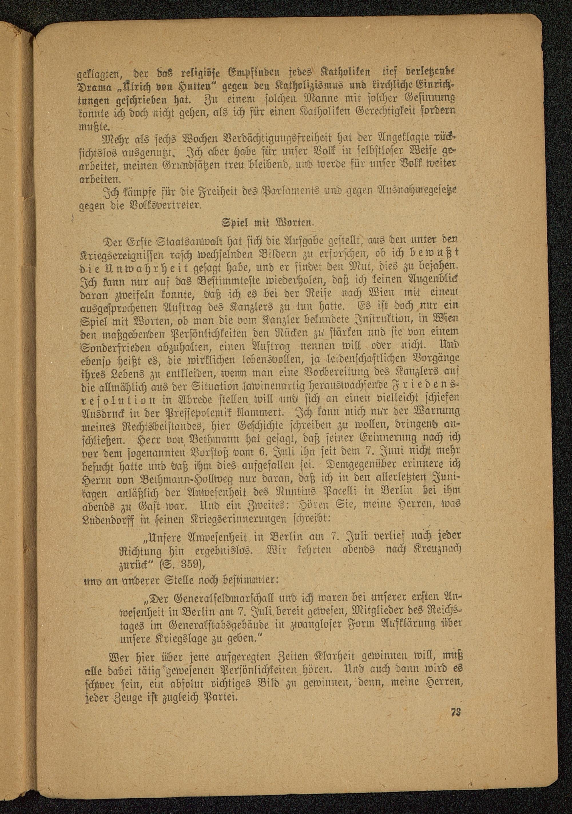 Der Erste StaatsamvaÄ hat sich die Aufgabe gestellt, rnus den unter denKriegsereignissen rasch wechselnden Bildern zu erforschen, ob ich bewußtdie Unwahrheit gesagt habe, und er findet den Mut, dies zu bejahen.Ich kann nur auf das Bestimmteste wiederholen^ daß ich keinen Augenblickdaran Zweifeln konnte, daß ich es bei der Reise nach Wien mit einemausgesprochenen Auftrag des Kanzlers zu wn hatte. Es ist doch nur einSpiel mit Worten, ob man die vom Kanzler bekundete Instruktion, in Wenden nraßgebenden Persönlichkeiten den Rücken zu' stärken und sie von einemSonderfrieden abzuhalten, einen Auftrag nennen will oder nicht. Undebenso heißt es, die wirklichen lebensvollen, ja leidenschaftlichen Vorgängeihres Lebens zu entkleiden, wenn man eine Vorbereitung des Kanzlers aufdie allmählich aus der Situation lawinenartig herauswachsende Friedens-resolution in Abrede stellen will und sich an einen vielleicht schiefenAusdruck in der Pressepolemik klammert. Ich kann mich nur der Warnungmeines Rechtsbeistandes, hier Geschichte schreiben zu wollen, dringend an-schließen. Herr von Bethmann hat gesagt, daß seiner Erinnerung nach ichvor dem sogenannten Vorstoß vom 6. Juli ihn seit dem 7. Juni nicht mehrbesucht hatte und daß ihm dies aufgefallen sei. Demgegenüber erinnere ichHerrn von Belhmann-Hollweg nur daran, daß ich in den allerletzten Juni»tagen anläßlich der Anwesenheit des Nuntius Pacelli in Berlin bei ihmabends zu Gast war. Und ein Zweites: Hören Sie, meine Herren, wasLudendorff in seinen Kricgserinnerungen schreibt: