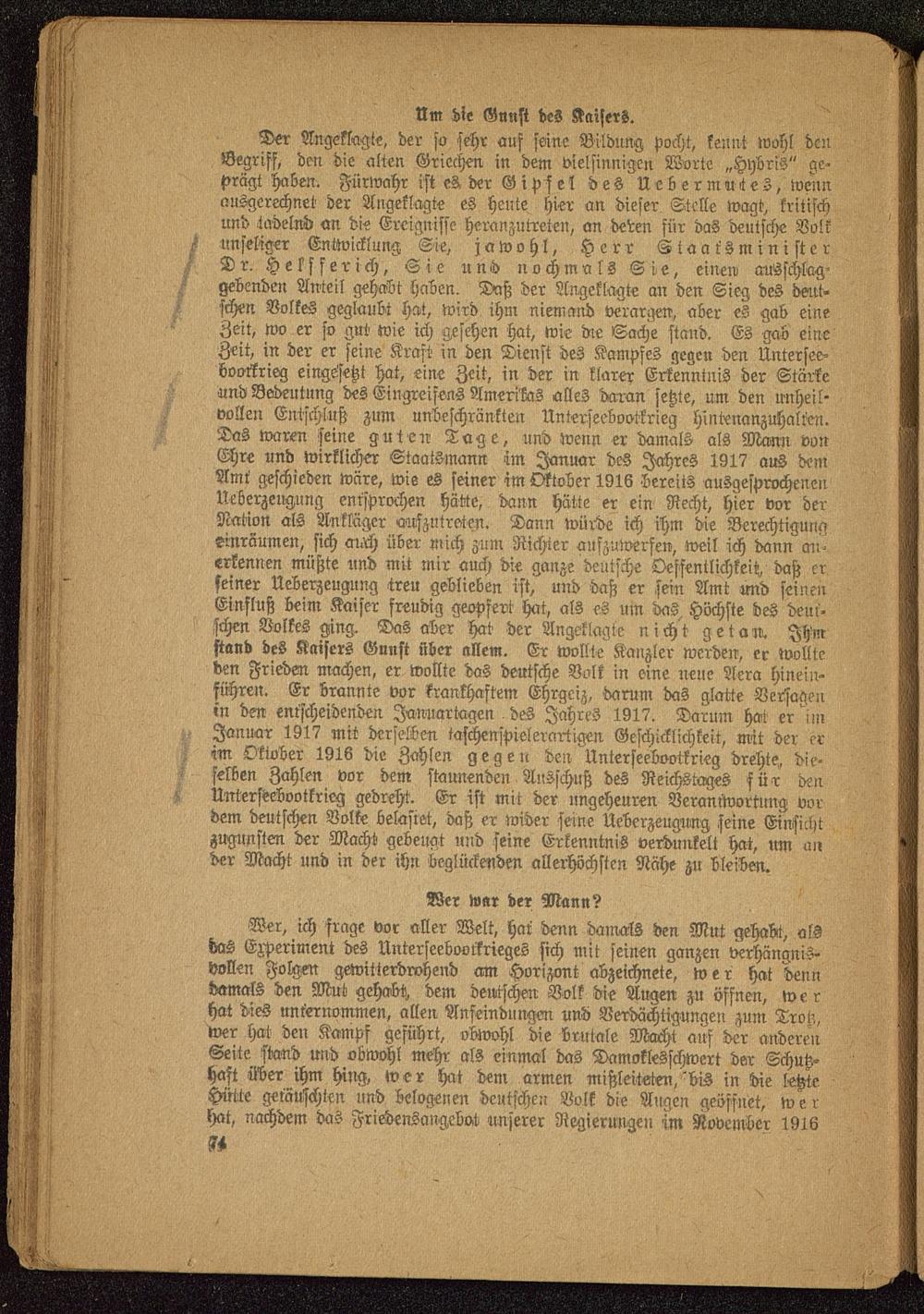 Der Angeklagt«, der so sehr auf seine Bildung pocht, kennt wohl denBegriff, den die alten Griechen, in dem vielsinnigcn Worte „Hybris" ge-prägt haben. Fürwahr ist es. der G i p s e l des Uebermntes, wennausgerechnet der Angeklagte es heute hier an dieser Stelle wagt, kritischund tadelnd an die Ereignisse heranzutreten, an deren für das deutsche Volkunseliger Entwicklung Sie, jawohl, Herr StaarsministerDr. Helfferich, Sie und nochmals Sie, einen ausschlag-gebenden Anteil gehabt haben. Daß der Angeklagte an den Sieg des deut-schen Volkes geglaubt hat, wird ihn: niemand verargen, aber es gab eineZeit, wo er so gut wie ich gesehen hat, wie die Sache stand. Es gab eineZeit, in der er seine Kraft in den Dienst des Kampfes gegen den Untersee-bootkrieg eingesetzt hat, eine Zeit, in der in klarer Erkenntnis der Stärkeund Bedeutung des Eingreifens Amerikas alles daran setzte, um den unheil-vollen Entschluß zum unbeschränkten Unterseebootkrieg hintenanzuhalten.Das waren seine guten Tage, und wenn er damals als Mann vonEhre und wirklicher Staatsmann im Januar des Jahres 1917 aus demAmt geschieden wäre, wie es seiner im Oktober 1916 bereits ausgesprochenenNeberzeugung entsprochen hätte, dann hätte er ein Recht, hier vor derNation als Ankläger onszutreten. Dann würde ich ihm die Berechtigungeinräumen, sich auch über mich zum Richter aufzuwerfen, weil ich dann cm^erkennen müßte und mit mir auch die ganze deutsche Öffentlichkeit,, daß erfeiner Ueberzeugung treu geblieben ist, und daß er sein Amt und seinenEinfluß beim Kaiser freudig geopfert hat, als es um das. Höchste des deut-schen Volkes ging. Das aber hat der Angeklagte nicht getan. IHMstand des Kaisers Gunst über allem. Er wollte Kanzler werden, er wollteden Frieden machen, er wollte das deutsche Volk in eine neue Aera hinein-führen. Er brannte vor krankhaftem Ehrgeiz, darum das glatte Versag?!!in den entscheidenden Januartogen des Jahres 1917. Darum hat er imJanuar 1917 mit derselben taschenspielerartigcn Geschicklichkeit, mit der erim Oktober 1916 die Zahlen gegen den Unterseebootkrieg drehte, die-selben Zahlen vor dem staunenden Ausschuß des Reichstages für denUnterseebootkrieg gedreht. Er ist mit der ungeheuren Verantwortung vordem deutschen Volke belastet, daß er wider seine Ueberzeugung seine Einsichtzugunsten der Macht gebeugt und seine Erkenntnis verdunkelt hat, um ander Macht und in der ihn beglückenden allerhöchsten Nähe zu bleiben.