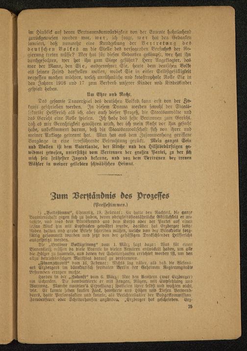 Das gesamte Trauerspiel des deutschen Volkes kann erst von der Ztt-kilnsl geschrieben werden. In diesem Drama werden sowohl der Staats«sekretär Helfferich als ich, aber auch dieser Prozeß, die Staatsanwälte unddas Gericht eine Rolle spielen. Ich habe das feste Vertrauen zum Gericht,daß es mir Gerechtigkeit gewähren wird, der ich mein Recht vor ihm gesuchthabe, unbekümmert darum, daß die Staatsanwaltschaft sich von ihrer undmeiner Anklage getrennt hat. Man hat ans dem Zusammenhang gerisseneVorgänge in eine irreführende Beleuchtung gerückt. Mein ganzes Seinund Wollen ist dem Vaterlande, der Kirche und den Hilfsbedürftigen ge,widmet gewesen» unterstützt vom Vertrauen der gröhlen Partei, zu der Mmich seit frühester Jugend bekenne, und von dem Viertranen der treuenWähler in meiner geliebten schwäbischen Heimat.