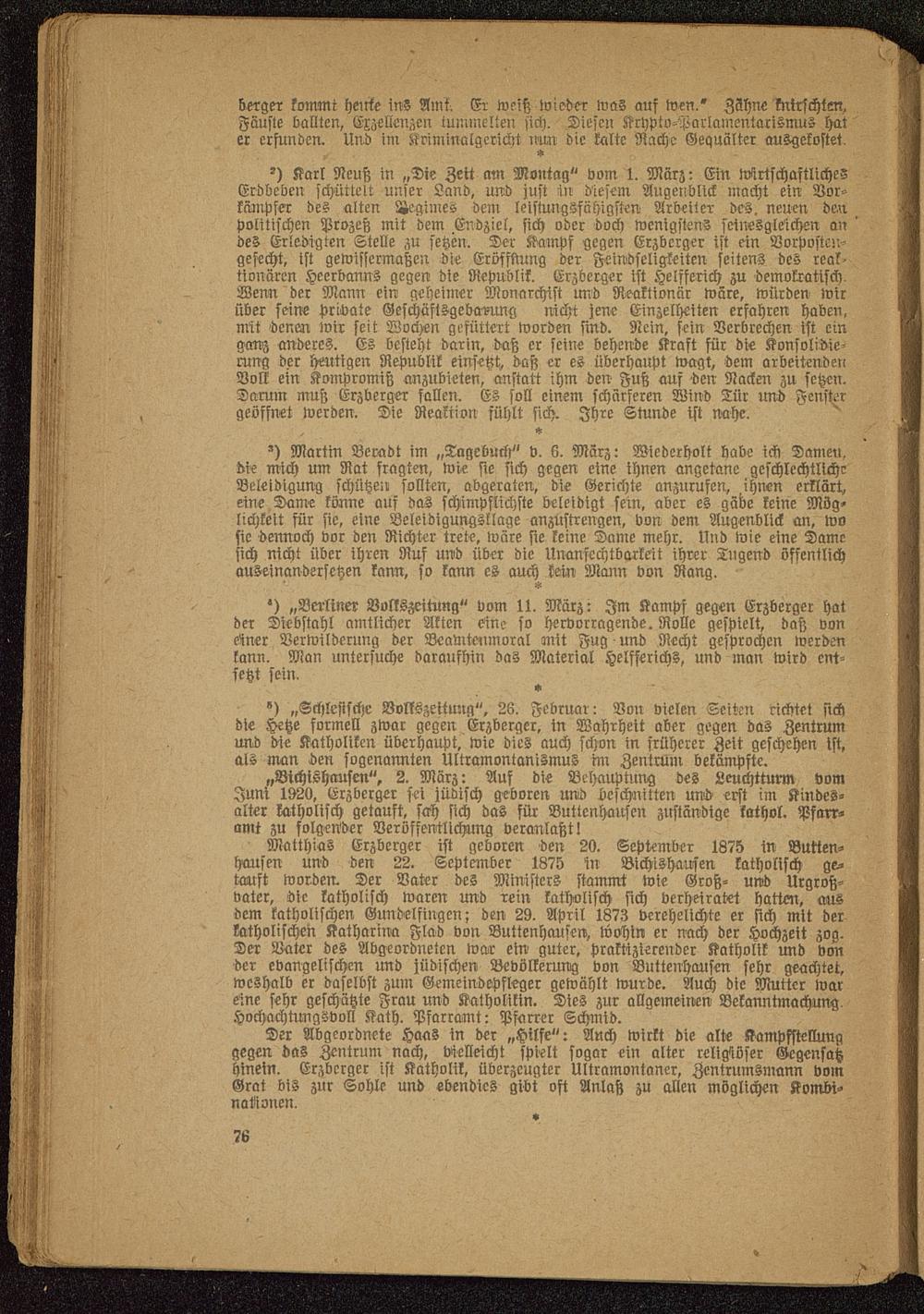 °) „Schlestschc Volkszettuna", 26. Februar: Von vielen Seiten richtet sichdie Hetze formell zwar gegen Erzberger , in Wahrheit aber gegen das Zentmmund die Katholiken überhaupt, wie dies auch schon in früherer Zeit geschehen ist,als man oen sogenannten Ultramontanismus im Zentmm bekämpfte.