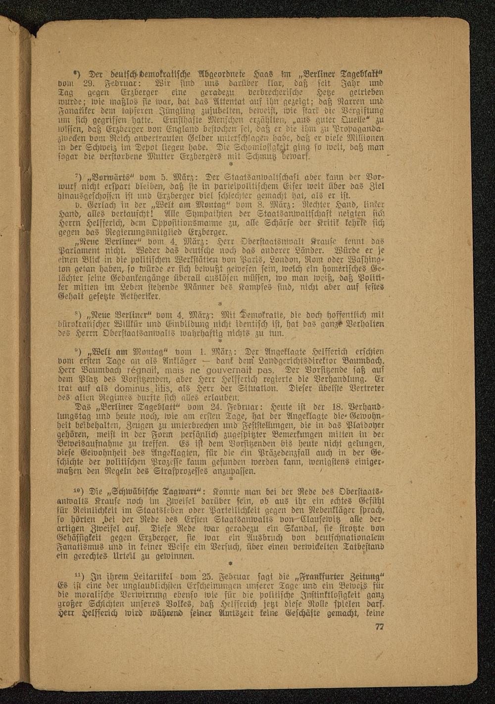 „Vorwärts" vom 5. März: Der Staatsanwaltschaft aber kann der Vor-wurf nicht erspart bleiben, daß sie in parteipolitischem Eifer weit über das Zielhinausgeschosscn ist und Erzberger viel schlechter gemacht hat, als er ist.