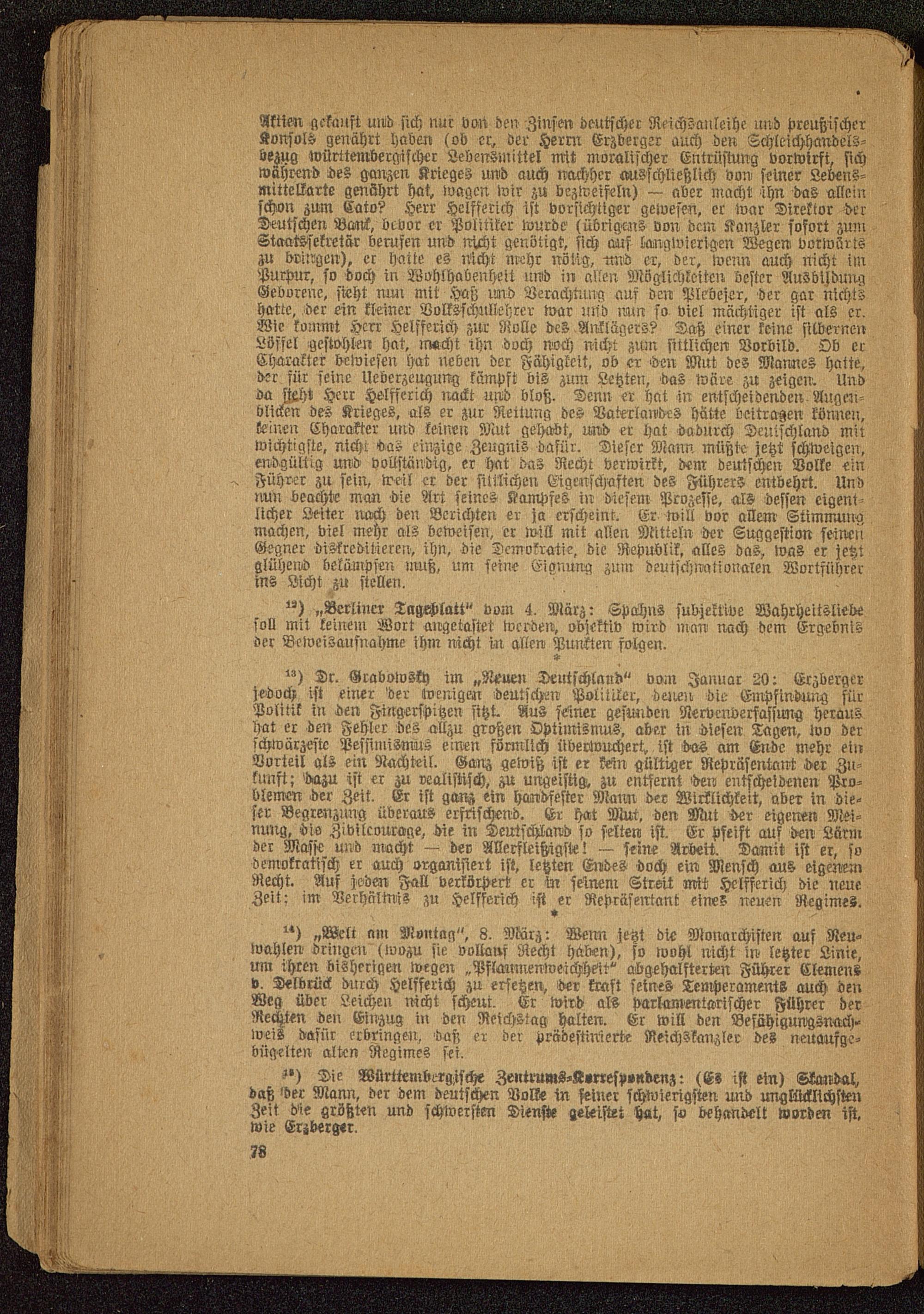 ") Dr. Grabowskh im „Muen Deutschland" vom Januar 20: Erzberger jedoch ist einer der wenigen deutschen Politiler, denen die Empfindung fürPolitik in den Fingerspitzen sitzt. Aus seiner gesunden Nervenverfassung heraushat er den Fehler des allzu großen Optimisnms, aber in diesen Tagen, ivo derschwärzeste Pessimismus einen förmlich überwuchert, ist das am Ende mehr einVorteil als ein Stachteil. Ganz gewiß ist er kein gültiger Repräsentant der Zu-kunft; 'dazu ist er zu realistisch, zu ungeisng-, zu entfernt «den entscheidenen Pro-blemen der Zeit. Er ist ganz ein handfester Mann der Wirklichkeit, aber in die-ser Begrenzung überaus erfrischend. Er hat Mut. den Mut -der eigenen Mei-nung, dio Zivilcourage, die in Deutschland so selten ist. Er pfeift auf den Lärmder Masse und macht — der Allerfleißigst«! — seine Arbeit. Damit ist er, sodemokratisch er auch organisiert ist, letzten Endes doch ein Mensch aus eigenemRecht. Auf joden Fall verkörpert er in feinem Streit mit Helfferich die neue