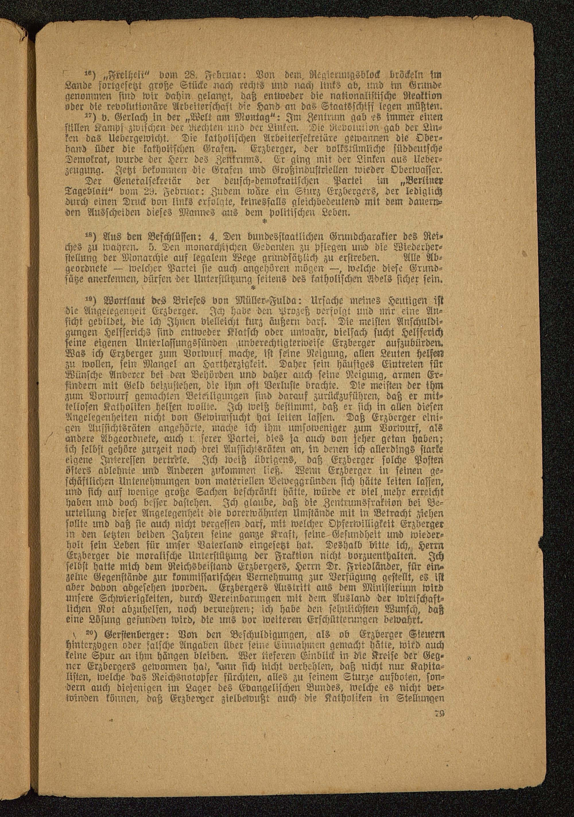 Der Generalsekretär der deusch-demokratischcn Partei im „BerlinerTageblatt" vom W. Februar: Zudem wäre ein Sturz Erzbergers, der lediglichdurch einen Druck von links erfolgte, keinesfalls gleichbedeutend mit dem dauern»den Ausscheiden dieses Mannes aus dem politischen Leben.