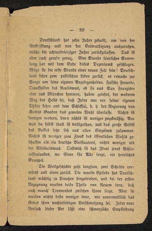 Deutschland hat zehn Jahre gehabt, um von derEntkräftung und von der Entmuthigung auszuruhen,welche die achtundvierziger Jahre zurückgelassen. Das istaber auch gerade genug. Eine Stunde feierlicher Samm-lung hat mit dem Ende dieses Dezeniums geschlagen.Möge sie die erste Stunde einer neuen Zeit sein! Deutsch-land kehre zum politischen Leben zurück, es erwache zurSorge um seine eigenen Angelegenheiten. Falsche Freunde,Quacksalber des Realismus, ob sie aus Sän Franziscooder aus München kommen, haben gelehrt, der moderneWeg des Heils sei, daß Jeder nur vor seiner eigenenThüre kehre und dem Schicksal, d. h, der Regierung vonGottes Gnaden das gemeine Wohl überlasse. Nichts istweniger modern, denn nichts ist weniger zweckmäßig. Nurwas du selbst tbust ist wohlgethan, und das große Selbstdes Volkes setzt sich aus allen Einzelnen zusammen.Nichts ist weniger zum Zweck des öffentlichen Wohls ge-schaffen als die deutsche Vielstaaterei, nichts weniger alsder Absolutismus . Oestreich ist das Ideal jenes Schla-raffenlandes, wo Einer für Alle sorgt, ein herrlichesExempel.